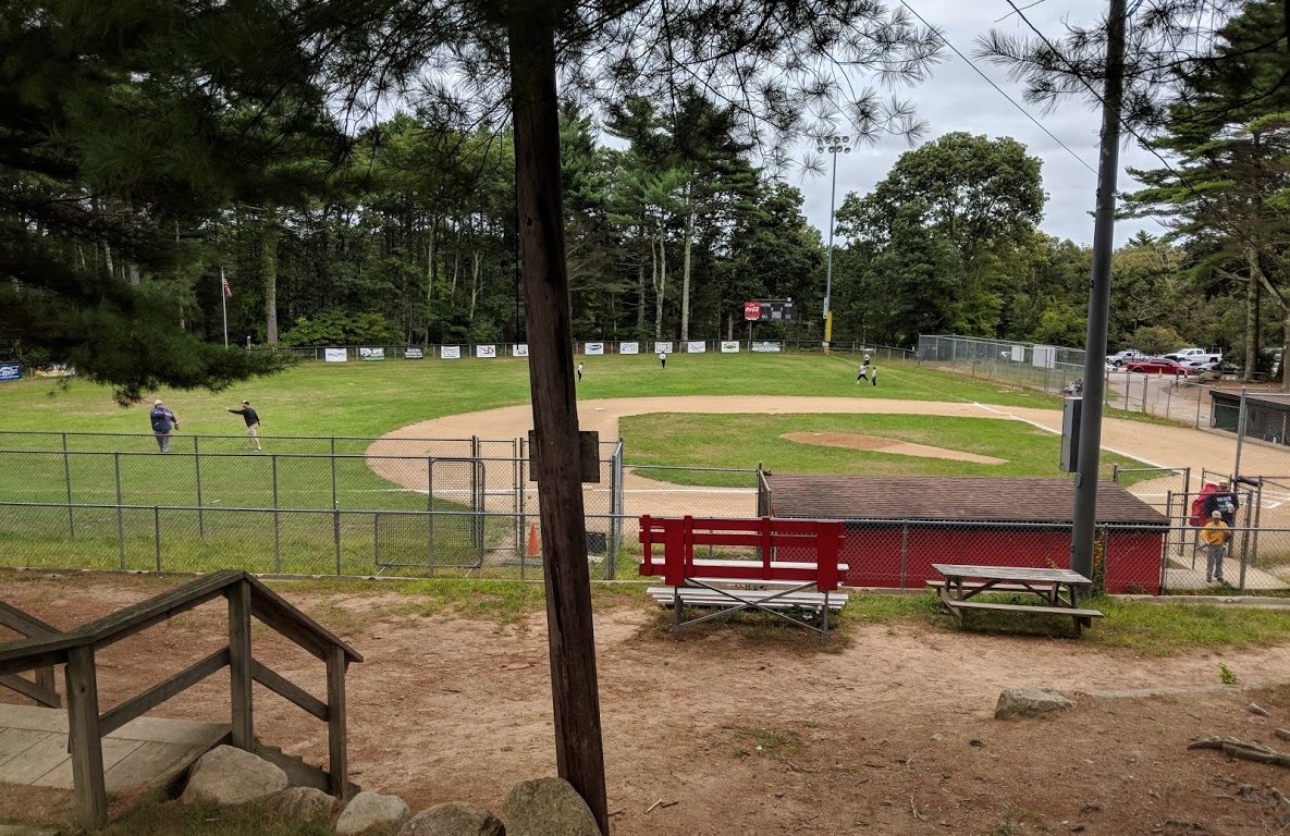 Exeter West Greenwich Little League features a Little League® size field as you walk in. There are also two baseball fields located up a small hill via set of wooden stairs. The Little League Field, marked Joan Tourgee Field, features plenty of seating along the first and third base lines. There is a snack shack and restroom area right behind home plate. There is plenty of sponsorship signage throughout the outfield fences as well as behind the dugouts. I like when leagues put the sponsorship banners closer to the fans in the stands. All three fields were in great playing condition when I played there this fall. The volunteers of Exeter West Greenwich take a lot of pride in making sure their fields are in top playing condition.