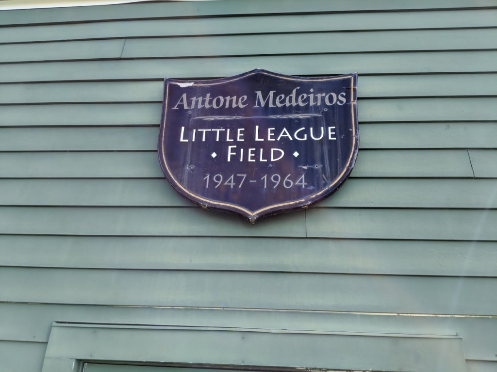 Middletown Little League plays in Rhode Island Little League’s District 2. This summer, I visited their baseball and softball complex located at 389 Aquidneck Ave in Middletown. The fields are located just outside the busy tourist and beach area of Middletown behind Aquidneck Elementary School. A plaque on the first field in view from the parking lot reads “Antone Medeiros Little League Field, 1947-1964” honoring the late Antone “Tony” Medeiros.