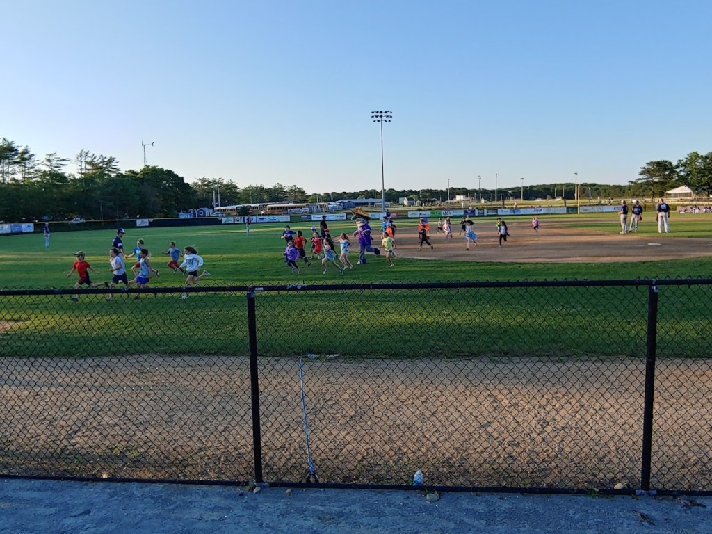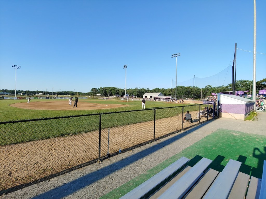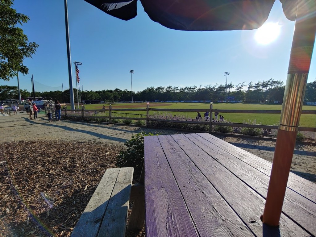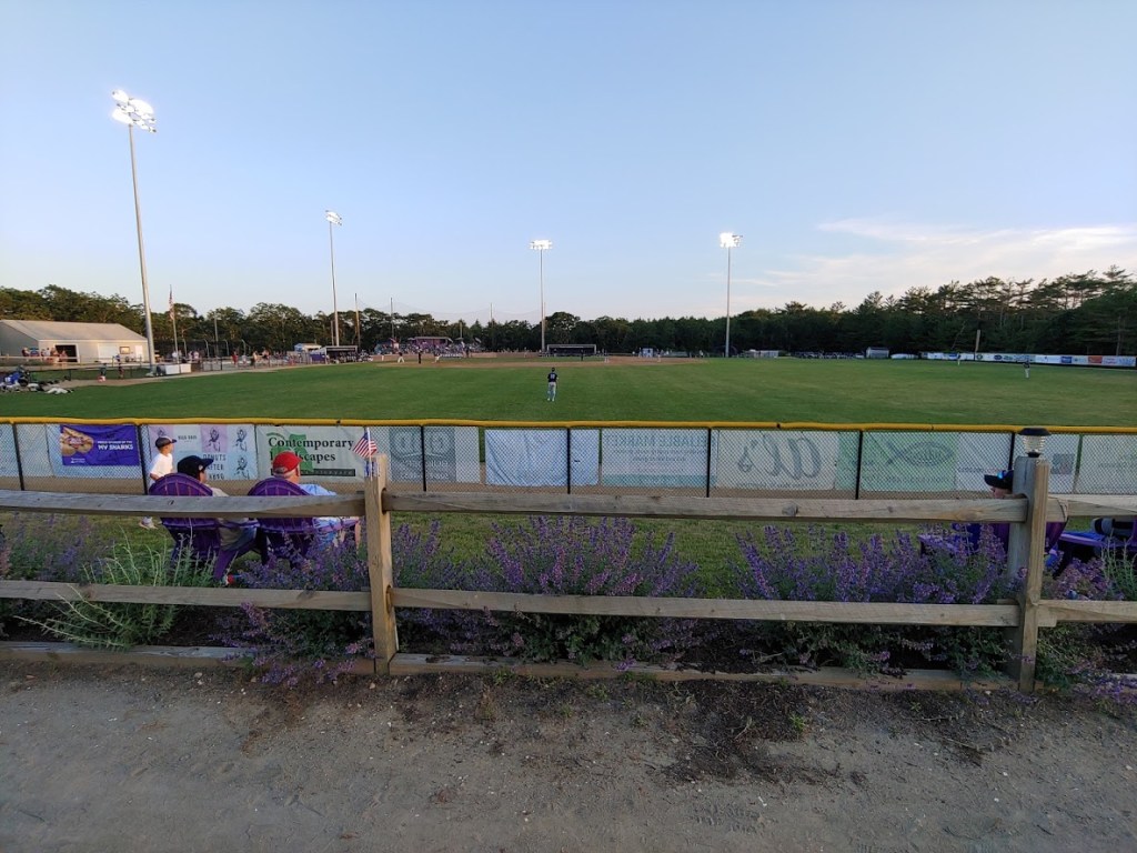 The game we attended was the second game of a doubleheader. The Ocean State Waves had won the first game and the grounds crew was preparing the field for the second game as we entered. The field had plenty of seating on the first and third base sides as well as a grandstand area behind home plate. There were purple chairs set up in the outfield for families to sit and watch the game from “the bleachers” section. It was great to be able to sit anywhere we wanted to get different angles and views of the game action. The sun was hot and bright and in your face on the first base side, but ducked behind the trees nicely on the third base side. I caught up with Waves President and GM Eric Hirschbein-Bodnar, who is also a Waves Coach, in between innings. We chatted for a bit about Game 1, which the Waves won on a walk off.