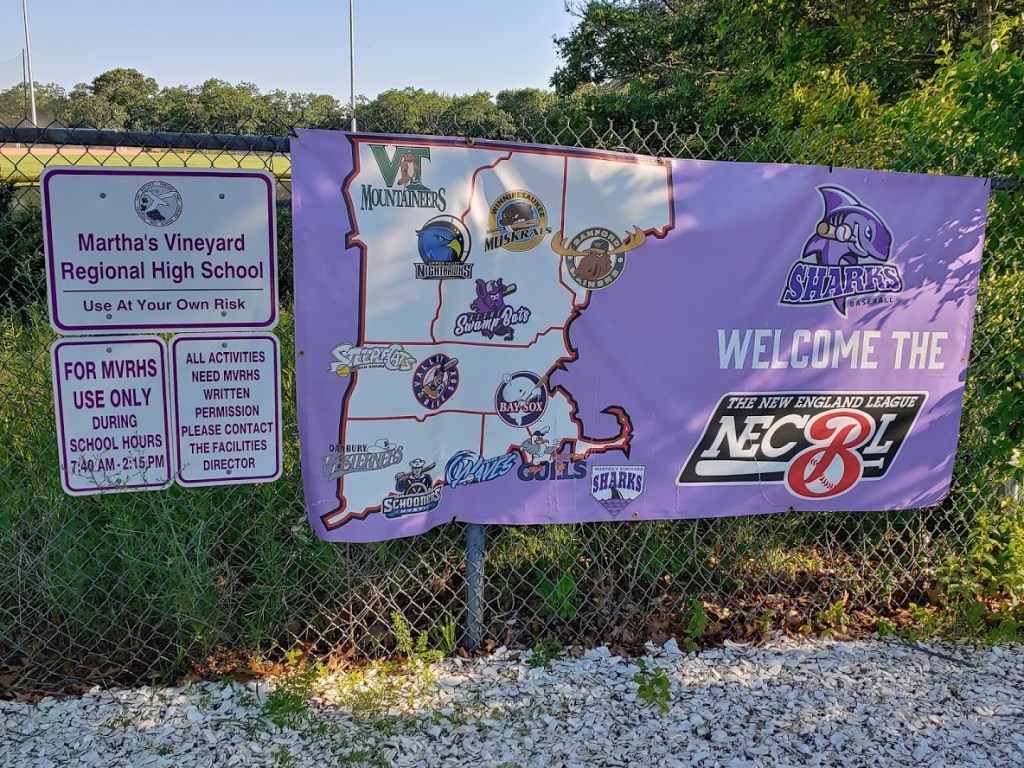The Martha’s Vineyard Sharks play in the New England Collegiate Baseball League, which has 13 New England teams from all over the New England area. This is the Sharks’ inaugural season in the NECBL, as they previously played in the Futures Collegiate Baseball League. The Sharks play their home games at Martha’s Vineyard Regional High School in Oak Bluffs. As I regularly check the NECBL schedule, I noticed that Rhode Island’s Ocean State Waves were slated to play at the Shark Tank on Monday July 1st. I decided to make a day of it with my wife and travel to MV for the beaches, lunch, and to check out the Martha’s Vineyard Sharks and their Shark Tank.