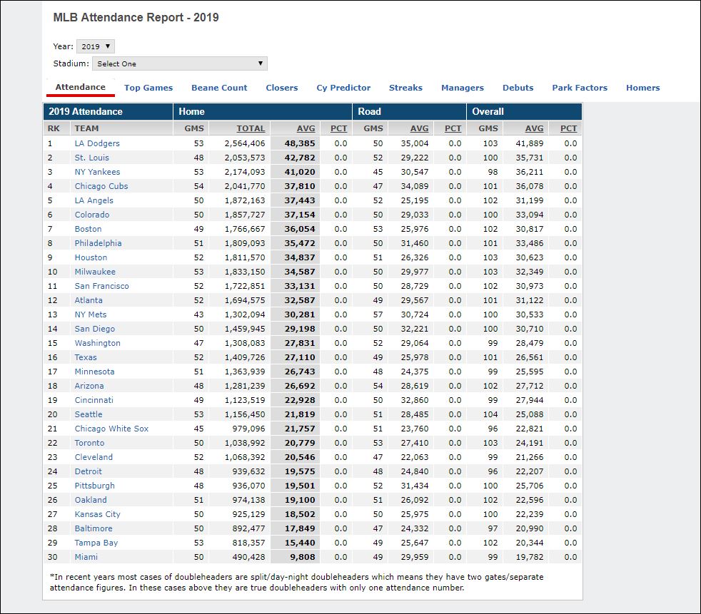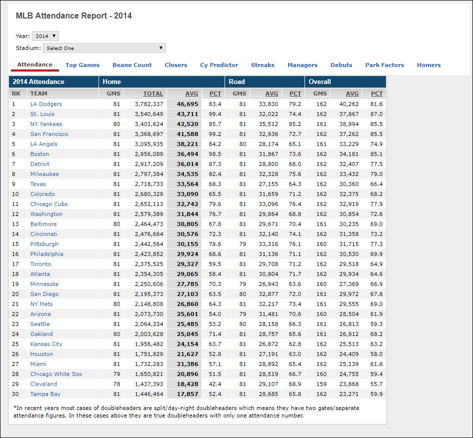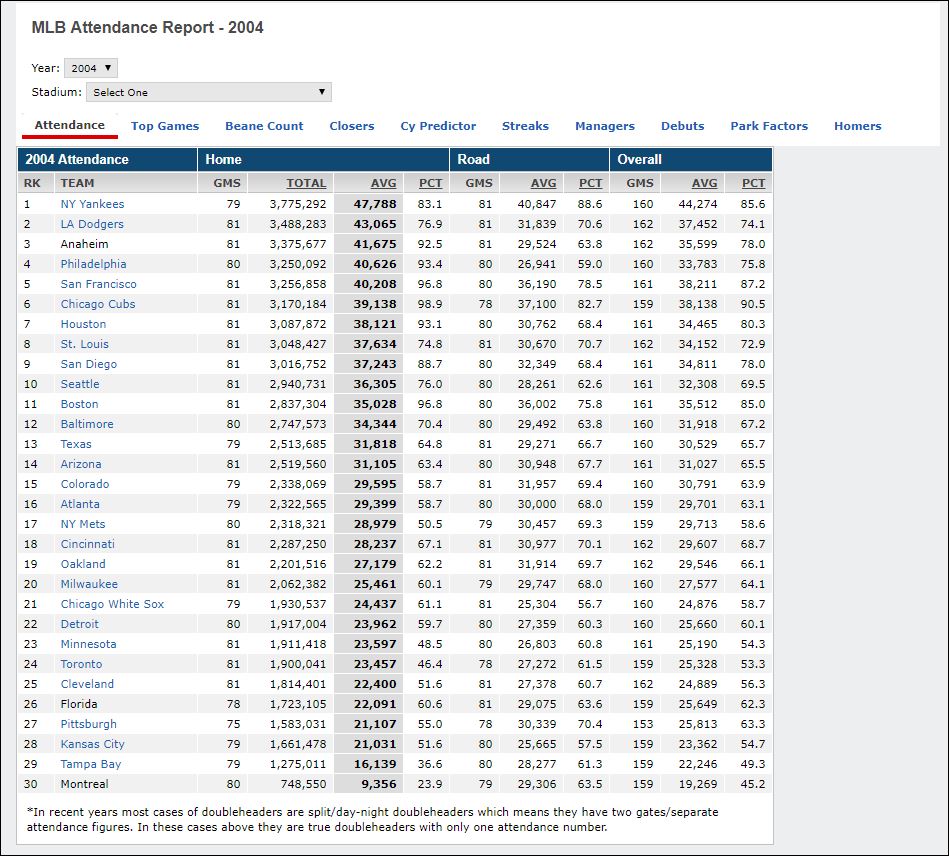 Here is a snapshot from http://www.espn.com showing attendance numbers over the last 15 years at professional baseball parks.