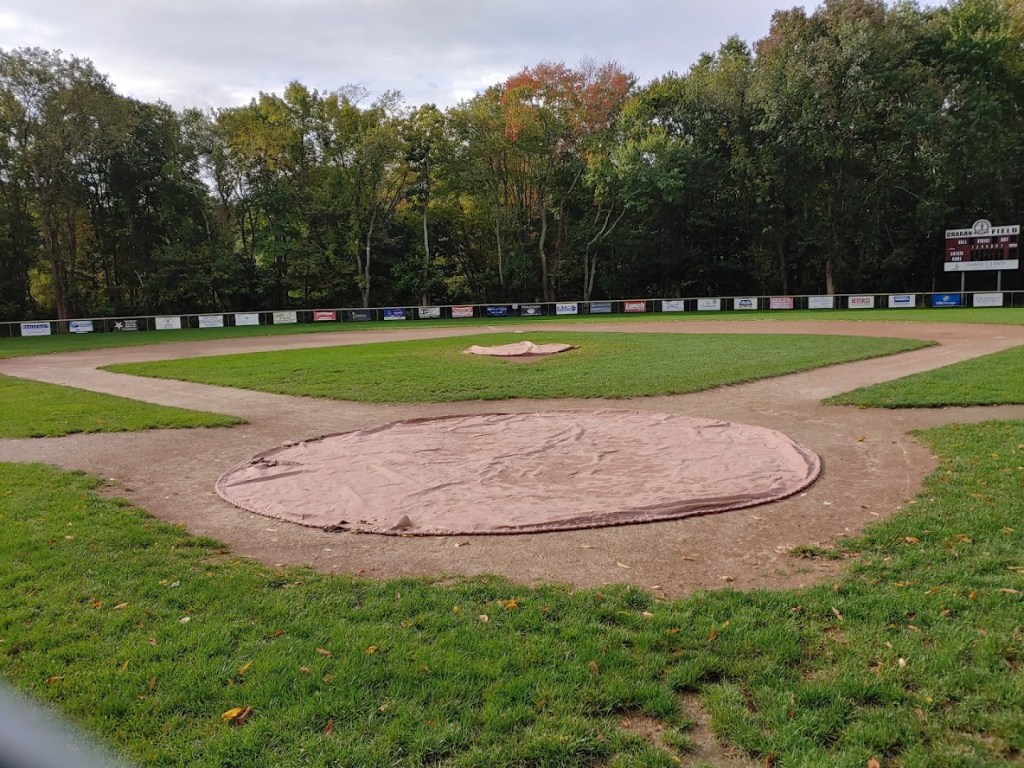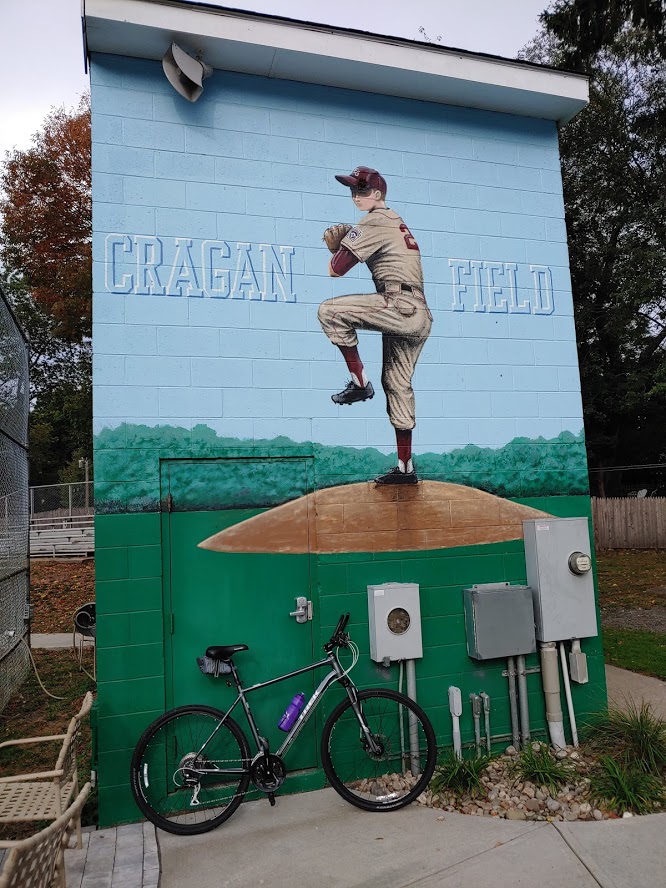 Day 6 of my Rhode Island Baseball Field Bike Relay Ride (Spectacular) started with a short bike ride from my home in North Kingstown to East Greenwich’s Cragan Field. If you are like me, you use landmarks, places of business, or interested markers to find things in Rhode Island in addition to the modern internet map systems. For Cragan Field, I took Post Road, up past the entrance to Goddard Park, then left at Citizens Bank, past Our Lady of Mercy School, then down the driveway to Cragan Field, home of East Greenwich Little League. This park has been a part of my coaching history with North Kingstown/Wickford Little League for years. It is a great neighborhood park with huge concession stand, batting cages, plenty of parking, and is always is fantastic shape for baseball. This past summer, Cragan was the host field for the 2019 12U State Tournament that crowned eventual New England champions – Barrington Little League. Great baseball park with some really awesome baseball murals on the dugouts and press box.