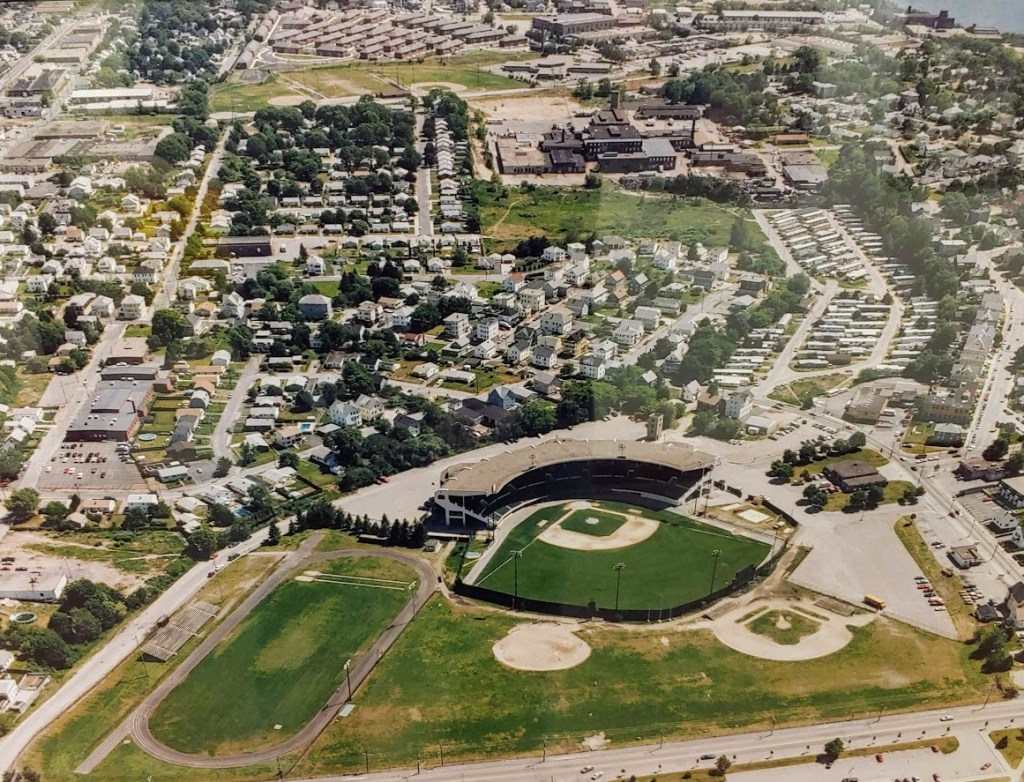 I was really intrigued by the layout of the stadium then as opposed to now. You can see in the older photos that the stadium was surrounded by mostly grass, a baseball diamond with grass infield, a skimmed field, and the oval track (which still exists today surrounding the football field.) The outfield area is bordered by a wall with sponsorship signage. There are no seats in any section of the outfield areas in the old stadium layout. I can make out one scoreboard in left field, lights for night games, and I think the Marlboro Man was in right field. The parking lot in the old photo stopped at the baseball diamond. In this old photo, you can even make out a school bus in the parking lot, perhaps dropping kids off from local schools to catch a game??? I imagine that local kids would play at this park, possibly during Pawtucket Red Sox games. There weren’t any time stamps on the photo that I could see.