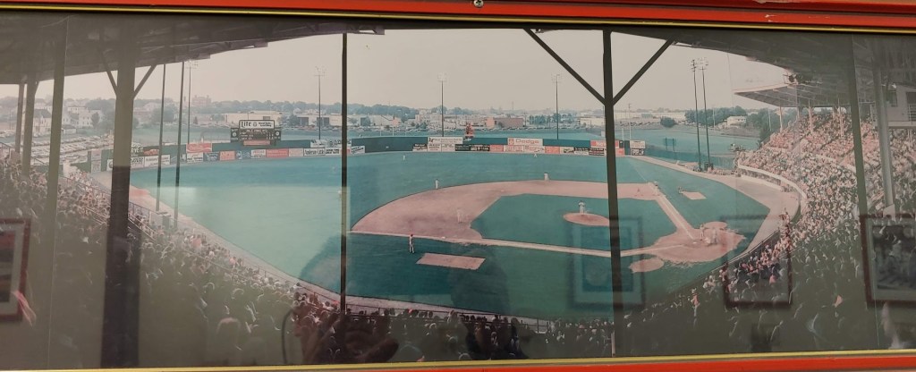 I recently visited the hallways of McCoy Stadium, which is packed with sports memorabilia and community service awards. I stopped at almost every section of the hallway to read up on player profiles, team awards, individual awards, public citations, and so much more. One set of photos really caught my attention. The views of McCoy Stadium over the years captured by photographers on the ground, in the air, the press boxes, and in the stands. Over the years as a visitor to McCoy, I have taken hundreds of photos from all sorts of cool angles. Here are a few of the photos I took in the hallways at McCoy which caught my eye.