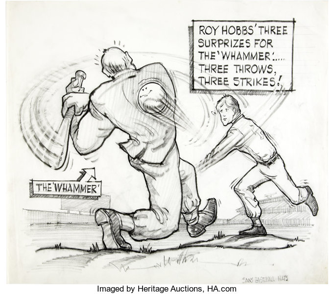 Last night on the MLB Network, over the span of nearly 3 hours, I watched one of my favorite baseball movies, “The Natural.” Robert Redford plays Roy Hobbs, a once can’t miss prospect who runs into a heap of trouble, falls off the planet only to return in glorious fashion later on in his life (personally and baseball wise.) Hobbs is chased and harassed and stalked by Max Mercy, played by Robert Duvall. Mercy is a local sports reporter with questionable ethics and a deep desire to make or break a superstar, like Hobbs. Mercy, along with other sportswriters, hole themselves up in the press boxes of stadiums throughout this fictional professional league with their notepads, typewriters, cigars, and a freshly sharpened pencil ready to tell the story. Mercy draws cartoons of Hobbs throughout the movie in both flattering and unflattering situations. His cartoons capture the essence of the moment – Hobbs striking out “The Whammer” at a local fairgrounds stop, Hobbs coming out of nowhere to hit towering home runs, Hobbs mired in a terrible slump, Hobbs the “Goat or Hero” in the last game sequence of the movie. Before there were cameras filming at games, tons of footage from field cameras, and certainly camera phones, there were sports cartoonist.