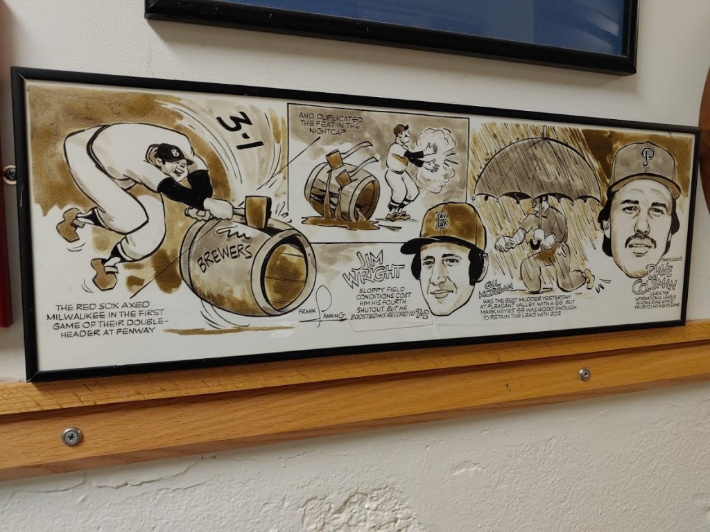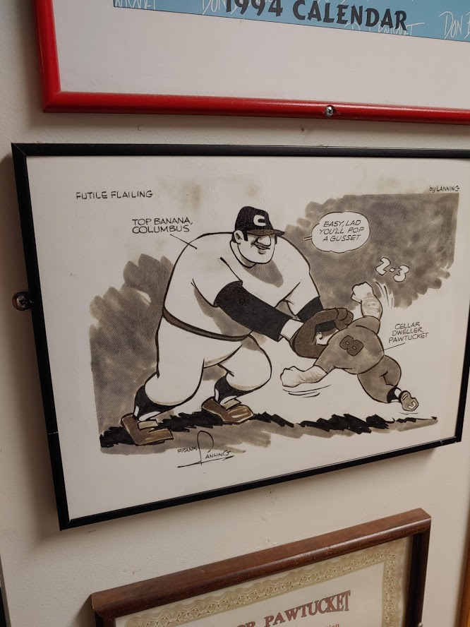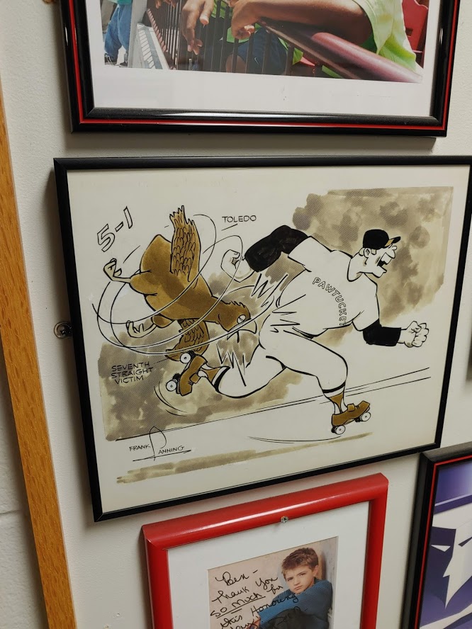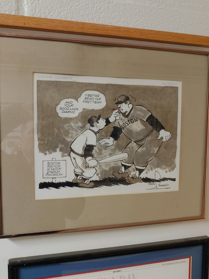 During my recent visit to McCoy Stadium’s hallway of sports memorabilia, volunteer citation plaques, and Pawtucket Red Sox historical awards, I couldn’t help but stop and “marvel” at the sports comics on the walls. Most are from the late Frank Lanning, who wrote and worked and drew some of the most iconic images of New England sports and history for the Providence Journal. Lanning’s cartoons tell the story of the moment. If the Pawtucket Red Sox beat the Rochester Red Wings in a significant game, the cartoon and captions tell the story. Is there a player that made a historical marker on the game, Lanning’s cartoon would depict that feat and the captions would do the rest, filling in the gaps. I stopped and read every cartoon and just smiled at the drawing, the words, the sarcasm at times, and the beauty of each one. Here are a few of the many cartoons that are hanging in the hallways of McCoy Stadium.