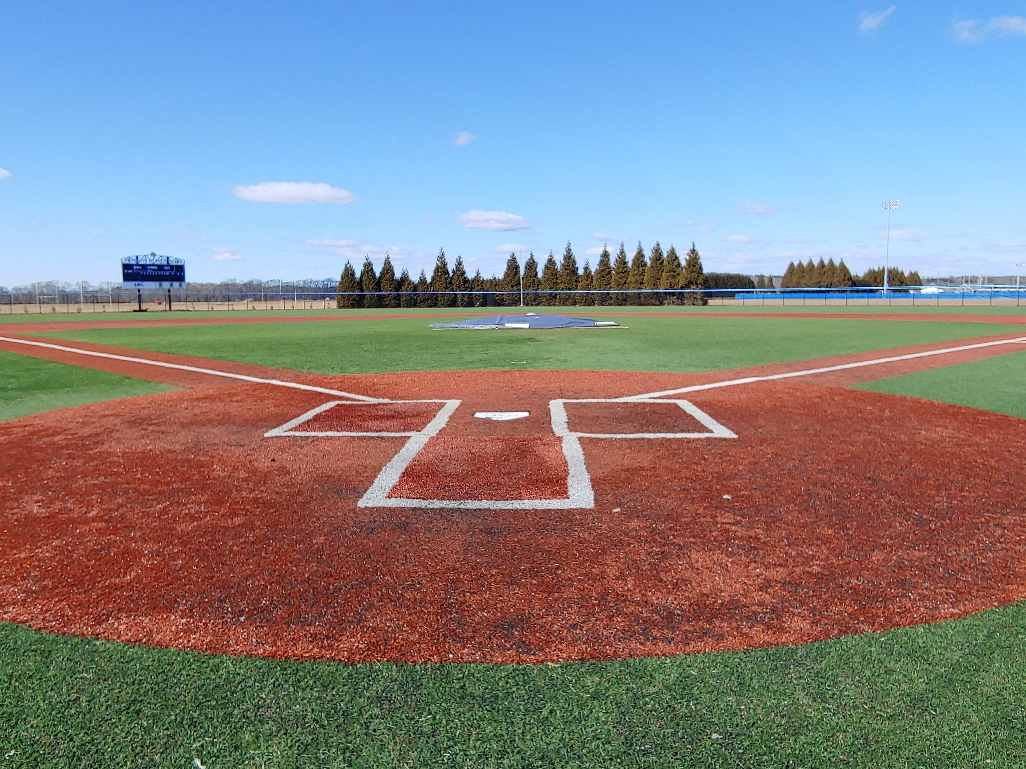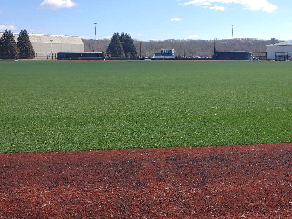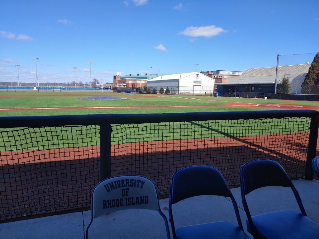 The baseball field at the University of Rhode Island is Bill Beck Field. Bill Beck was a URI Football and Baseball coach in the 1940s, and the university honored his dedication to sports by naming the field after him in 1966. Originally, a traditional grass and dirt/clay field, the University renovated Bill Beck field starting in 2007 with a new field surface which still exists today. The renovations were completed in 2009. Durable, reliable astroturf really helps with the unpredictable weather of New England, especially in the Spring time when field maintenance is a real challenge on natural grass surfaces. Additional field, dugout, press box, and grounds upgrades have happened since the big renovation in 2009. I visited Bill Beck field yesterday to get a closer look.
