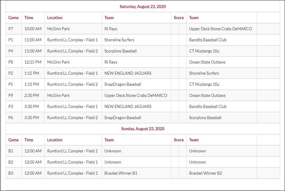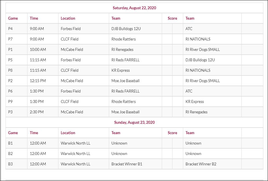 After a busy summer schedule of league games, local showcase events, and regional tournaments, the 2020 AAU Summer Season is coming to a close. But, before that happens, each division will have a playoff to determine the 2020 Division champs for 9U, 10U, 11U, 12U (D1, D2), 13U, 14U, and 15/16U. The best and brightest will compete this weekend on some of the most incredible youth baseball fields here in Rhode Island. From Rumford to North Kingstown, Warwick to Broad Rock, Forbes Field to CLCF, Rhode Island’s talented up and coming baseball stars will be on display. Here is a snapshot of the proposed schedule of games for each division.