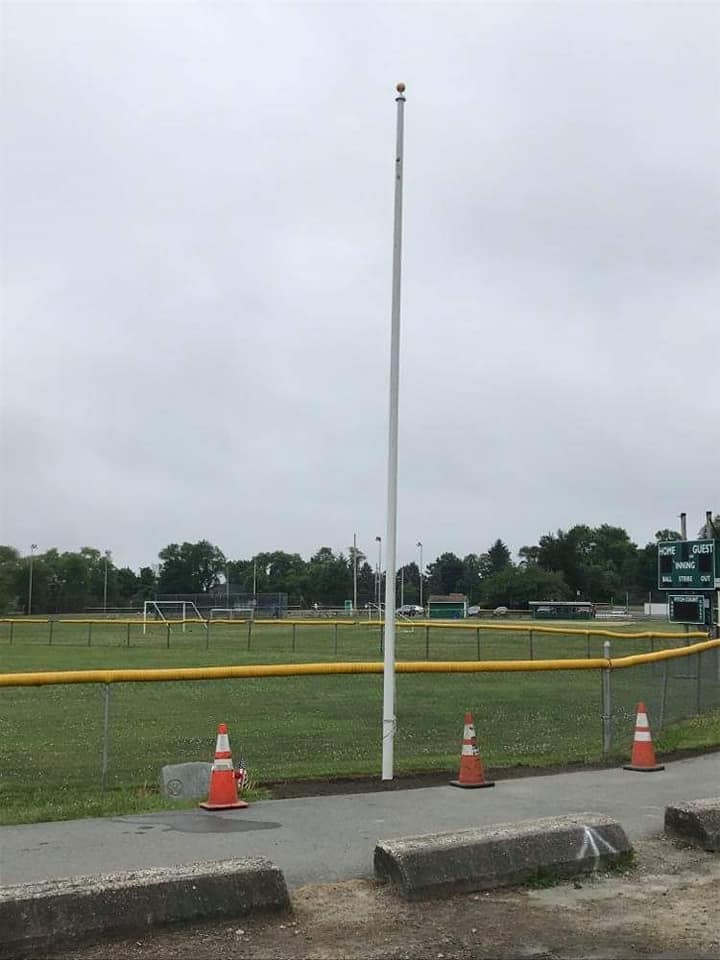 “For those of you familiar with the old and unused flag pole at Town Farm, we have some awesome news for you. Mr. Leslie Haworth, a friend of TLL President David Paull, offered to donate a 25′ flag pole and flag. Mr Haworth is a Little Compton, and part time Tiverton, resident and recently retired from his business, Atlantic Flag and Banner out of East Providence. The flag pole was picked up last month and delivered to the Department of Public Works garage. Yesterday a crew from DPW made quick work of removing the old and smaller flag pole and installing the new flag pole. The next step is the installation of a cleat to secure the halyard before the Stars and Stripes can overshadow Town Farm. The flag will fly 24/7 as there is a light on the nearby telephone pole that is directed at the flag. Tiverton Little League wishes to publicly thank Mr. Haworth for this tremendous donation to our community. We also wish to thank the crew from DPW that installed the new 25′ flag pole with such care and efficiency.“