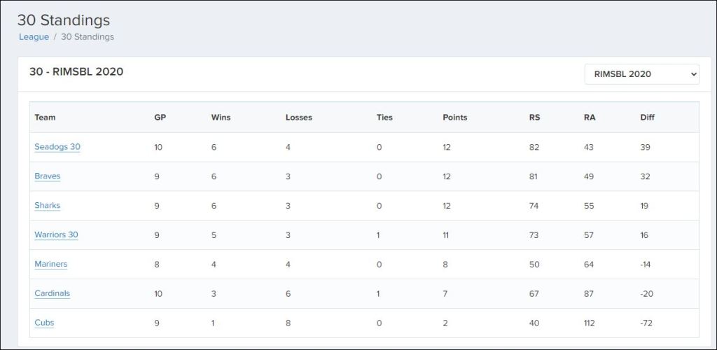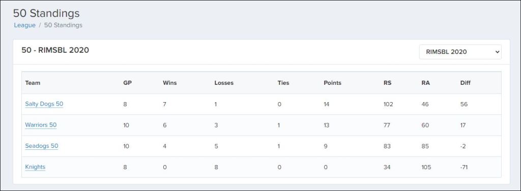 Here is a snapshot of the current standings for each division, taken from the official website of the Rhode Island Men’s Senior Baseball League – www.leageez.com/league/RIMSBL.