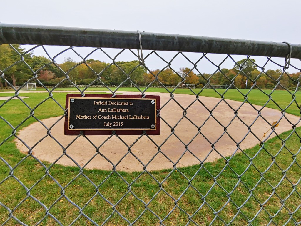 As I tend to do at every baseball park, I seek out memorial plaques, commemorative signs, and more recently safety guidelines for the field. I found both on the fencing behind the first base dugout area. Covid-19 CDC safety procedures for the field occupants clearly illustrated on one sign. Next to it, a plaque dedicating the infield to Ann LaBarbera, the mother of Prout School Head Baseball Coach Mike LaBarbera.