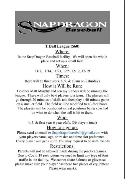 Snapdragon Baseball is a Rhode Island AAU baseball organization and has an indoor training facility located at 560 South County Trail in Exeter. Snapdragon has become a fantastic resource for Rhode Island baseball and softball families. Owner Jeremy Reposa asked me to share a few of his clinic and program options, which are starting in just a few weeks time. Check out the two photos attached for the T-Ball League program as well as fall clinics run by Jeremy and Matt Murphy.