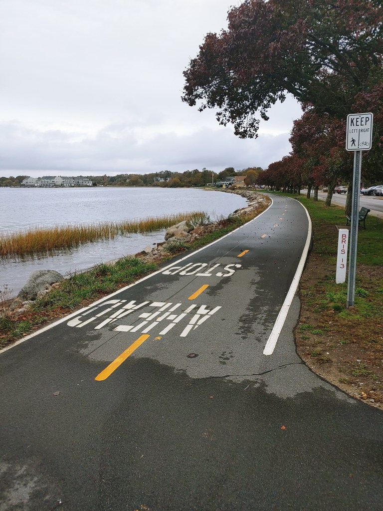 On a mostly rain soaked morning, I hopped on the East Bay Bike Path to ride what I would call Stage 3 of my upcoming Charity Ride for the RI Community Food Bank. This particular stage starts in East Providence and rides down along the Providence River, past Cranberry Island and Squantum Point, and into Barrington, then Warren, and eventually landing in Bristol. It is about a 14 mile stretch of bike friendly roads that really accentuates life in East Bay – beautiful harbor views, quaint neighborhoods, small businesses, comfortable living. Here are a few photos I took along the way as I rode through puddles and more puddles on the bike path.
