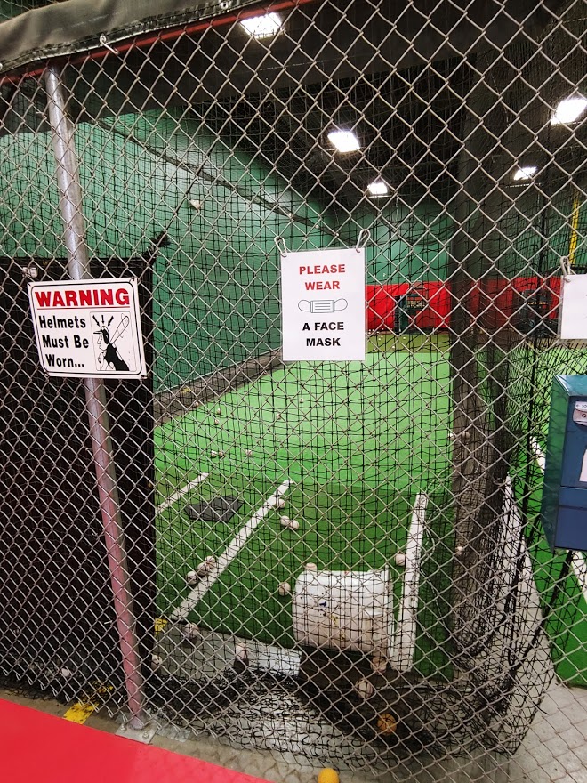 As I walked into the facility itself, I saw a row of batting cages, screened off, with signage on the netting. The lobby had two tables, socially distanced apart, with a blue taped line and clearly marked socially distance stickers on the floor. There was a contact tracing sign in sheet on one of the lobby tables. The walls were filled with Ken Ryan memorabilia – baseball cards, framed jerseys, baseball posters. There was an office where players and family members check in, get their temperature taken, answer important safety questions (similar to the signage), and are cleared for entry/usage in the facility. Every person in the building was wearing a face covering of some sort – mask, gaiter, bandana. The players, the coaches, the parents that dropped off their kids, even the owner Ken Ryan – all compliant, all wearing masks.