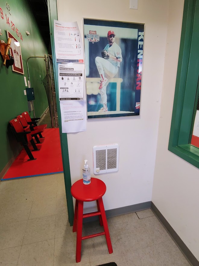 So, as I walked into KR Baseball, I began to hit the baseball sounds that bring music to my eyes – the CRRRACK of the bat, the THUMMMMP of the pitching machine delivering a fastball, the SMAAAACK of the baseball into the catcher’s mitt. Baseball was happening in the facility and I was eager to see how they were accommodating players and families. I began to look closer at more signage, this time it was a safety checklist from the ReOpeningRI website and some other printed materials outlining the facility’s commitment to safety. And on the stool underneath the poster of Ken Ryan (yes he pitched for the Philadelphia Phillies), was a red stool with a bottle of hand sanitizer. So, before I even entered the building, there was an understanding that KR Baseball Academy was going to do their part to keep its members safe.