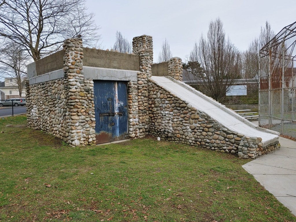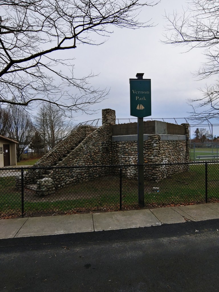 When I returned to the home plate area of Cottrell Field, I took a moment to walk around the unique stone structure with the chimney and slide. There were stairs leading up to a landing area, which gave me a great view of Vernon Park and Cottrell Field. As I do with every baseball field I visit, I searched around the stone structure for markings or plaques but was unsuccessful. Luckily, we have “Google” and so I entered “Vernon Park, Newport” into a search and came up with some really cool webpage results. One result I found really fascinating was the Newport Historical Society‘s page on the Works Progress Administration or WPA and their contributions to parks in Newport. According to the Newport Historical Society, “Locally the WPA built sidewalks and most of the stone walls, grandstands, concession buildings and other facilities in Newport’s public parks. Vernon Park, Freebody Park and Cardines Field are the most visible examples.” The stone craftmanship is just incredible. And given that it was built in the WPA era of the US history, this structure is roughly 80 years old which is just blew me away.