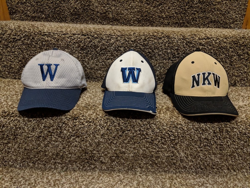 These hats are special because they were all worn by my sons when they played youth baseball. Wickford Little League is now North Kingstown Wickford Little League. The “W” has been replaced with “NKW” on the hats. Style wise, the goal for the NKW hats was to mirror the colors from North Kingstown High School, which I am familiar with. Here is my hat from my NKHS days: