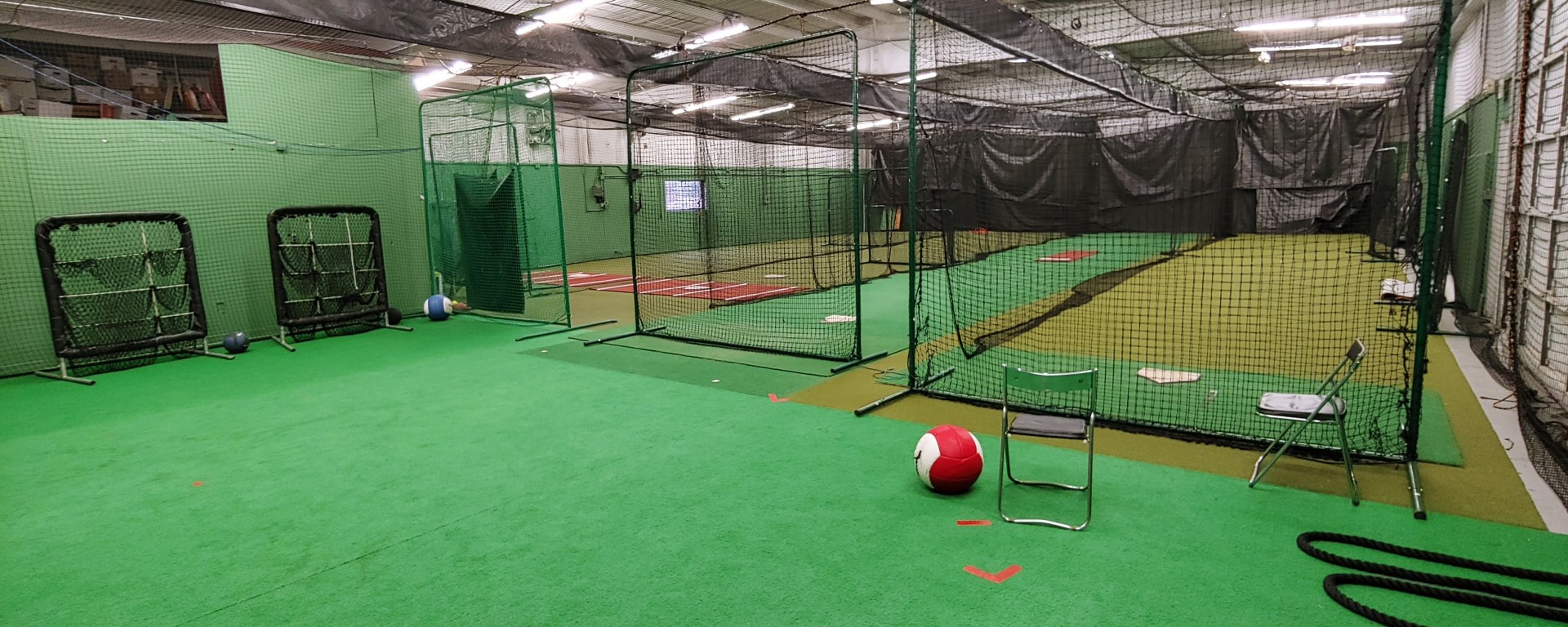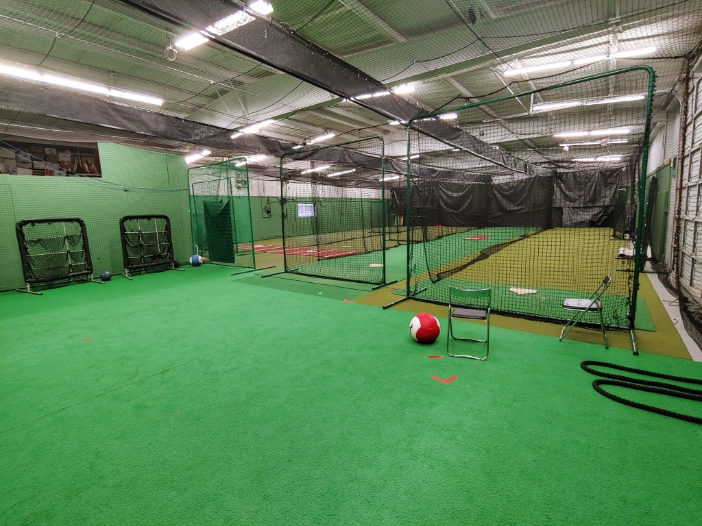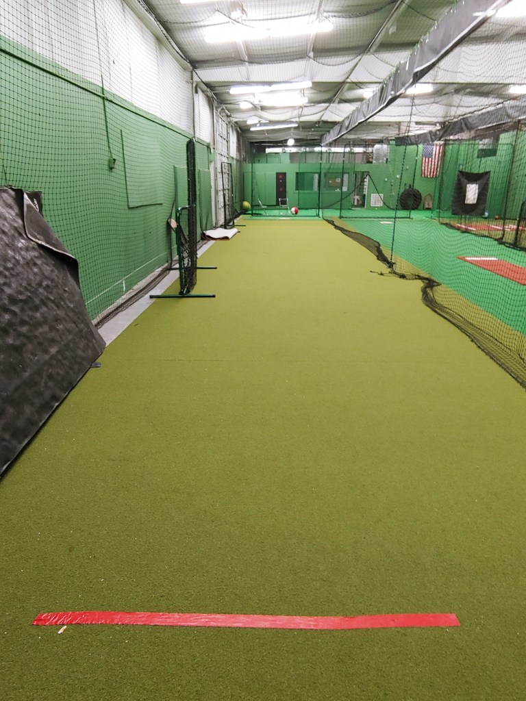 When I arrived, the Coventry Crush Softball team was just finishing up their indoor practice time. I waited until their coaches and players departed the training area to go inside and take photos. Once inside, I could see that the facility now had a larger, 4 section cage set up as well a 5th section for warmups, conditioning or individual work. Home plate batting mats, portable pitching mounds, L-Screens, pitching machines, protective netting on all sides – all positioned nicely throughout the facility. The entire facility was clean, well lit, easy to enter/exit, well maintained, and definitely well stocked with baseball and softball equipment.