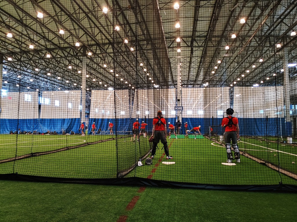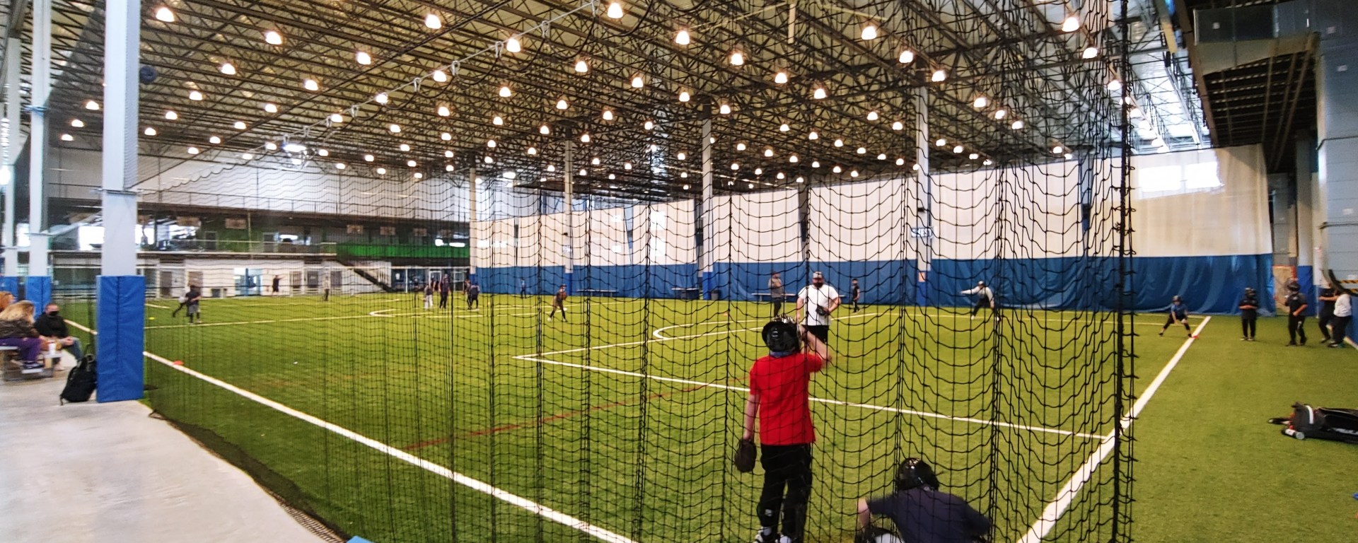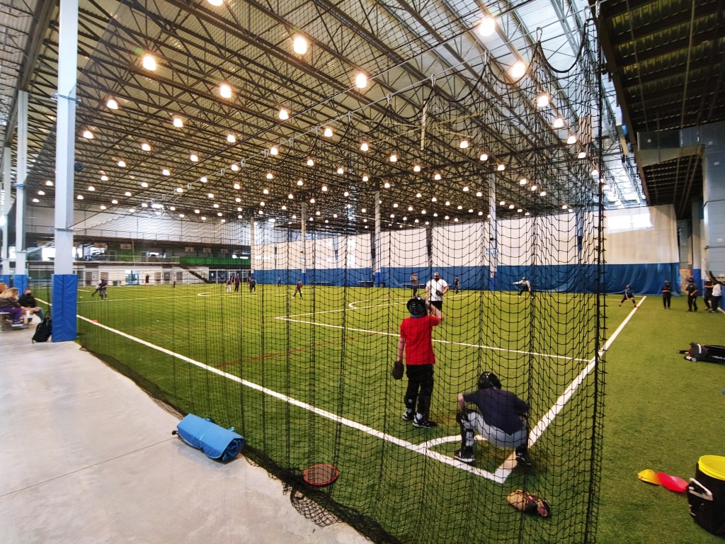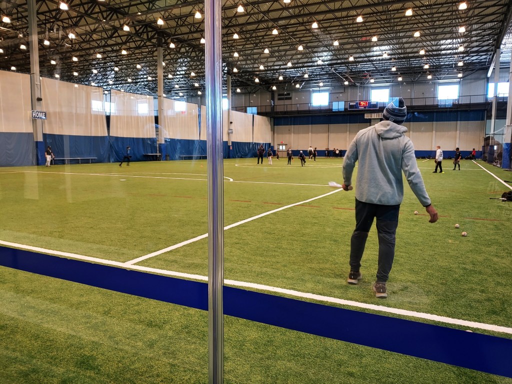 My first impression of Longplex, in the words of the incomparable Harry Carey, “Holy Cow!!!!” As I walked to the left of the front desk entrance, I observed a team practice infield drills. As I approached the netting, I noticed it was the Rhode Island Rays Baseball Club players and coaches working on some ground balls and situations. There was a metal bleacher on the other side of the protective netting, so I sat and watched practice for a bit. The space was incredible. The Rays had set up cones for bases and their coach was hitting ground balls from a typical home plate distance. On the far side of this designated area, another group of RI Rays players were working on base running skills with a coach and a catcher. The players were getting a ton of reps in and really utilizing the massive space for their practice.