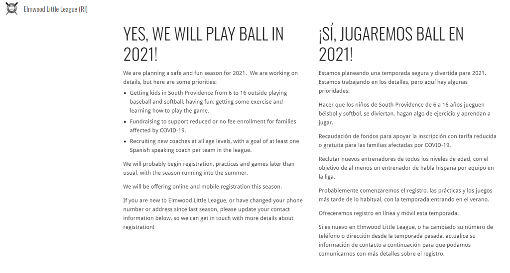 This weekend, I received a message from Richard Hemphill, President of Olneyville at Silver Lake Little League. Richard shared a photo of his registration post and asked me to share it on my pages, which I am always happy to do. The registration post included two photos, one in English and one in Spanish. I asked him what the impact was on his community members having the two posts in English and Spanish. “Our league is multi-cultural,” stated Richard, “we embrace the fact that we have many different kids from many different walks of life.” Seeing Richard’s post and answer sparked an interest to find out what other leagues are posting in multiple languages.