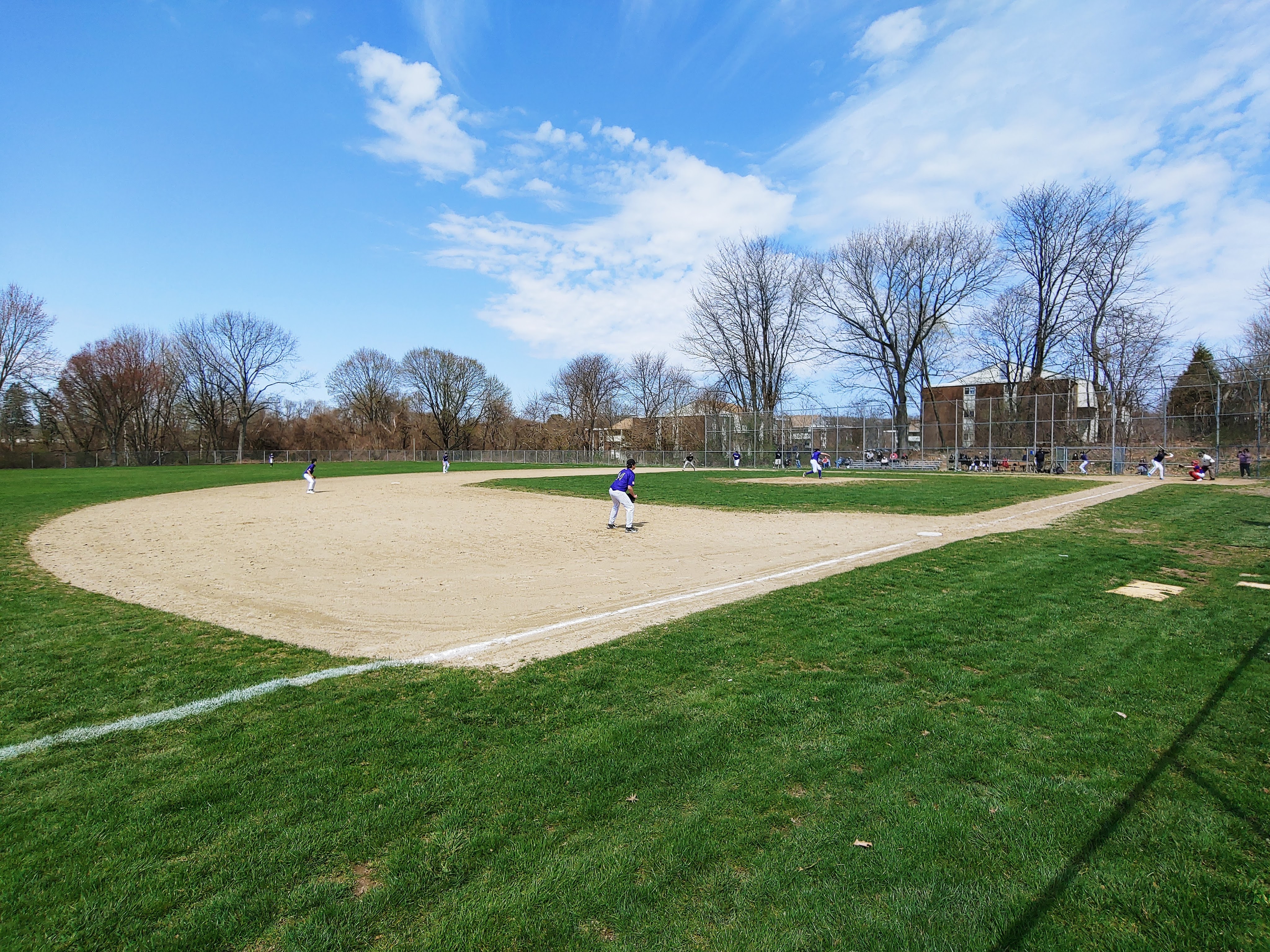 Saturday morning, through the GameChanger app on my phone, I spotted a Saturday morning game that peaked my interest. The 14U RI Rays were set to play the 14U New England Scorpions at Cranston’s Calise Field at 10am, so I decided to take the drive from my home in North Kingstown. It was a seasonably warm Saturday morning in April, very little wind, and just a spattering of clouds in the sky when I arrived at the field off Dyer Ave. I have been to Calise several times over the years and one of the things I love are all the elevated views. For example, the back parking lot gives the fan, the parent, the incoming player a fantastic first view of the field. Like this photo I took yesterday: