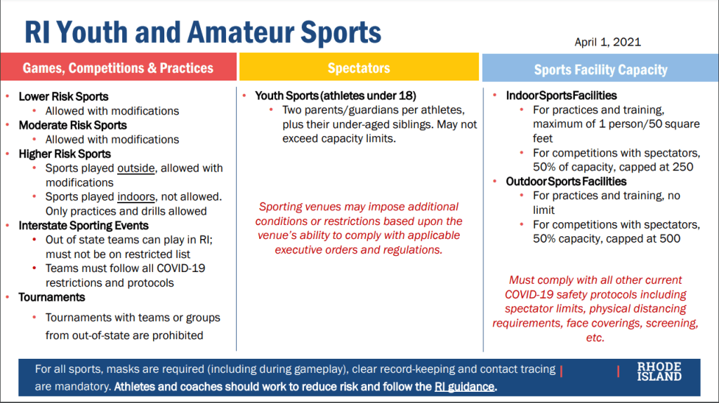 Guidelines for Spectators – Due to the changing restrictions affecting gathering size limits, and facility guidelines spectators will be limited to 2 parents/guardians per athlete. Schools/facilities can impose stricter guidelines. Please see the Reopening RI website for details. http://www.dem.ri.gov/programs/media/documents/ri-sports-summary.pdf“