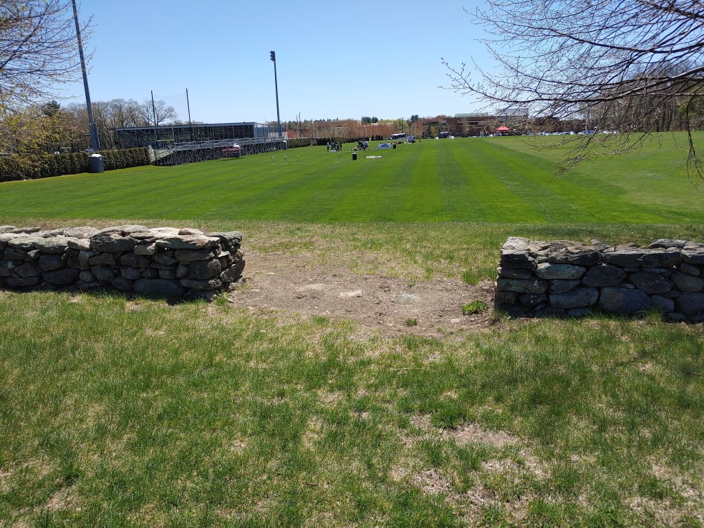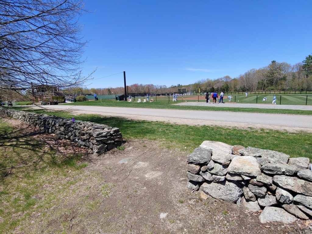 I was interested in the fans stationed just passed the outfield fencing area and what their view was like, so I hopped off the bleachers and made my way around the third base perimeter of Conaty Park. From there I could see the Bryant bullpen area, and signage reading “Bryant Baseball.” To my left, there was more of the track and field meet competitors and activities. I finally made it out to the stone wall perimeter of the field and spotted fans in folding chairs just relaxing and watching the game. The sun was shining brightly and there was some shaded areas where some fans had camped out at. The stone walls once again provided the perfect, natural perimeter between the field area and the wooden area.