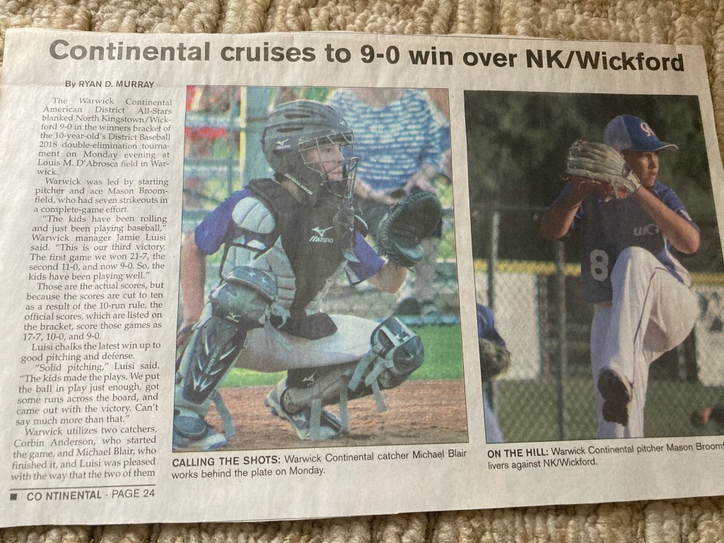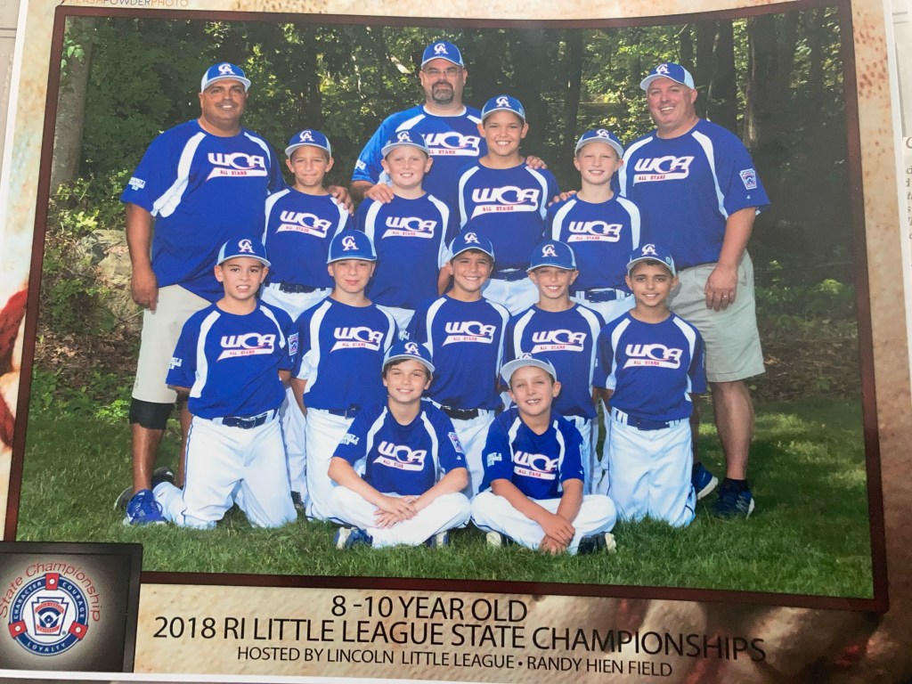 Mason’s 10-year-old Little League All Star Team was a force to be reckoned with. They won their division title, then went on to win the RI State Tournament and finally moved onto the Regional Tournament which just so happened to be hosted by Cranston Western Little League that Year. What an experience for both the kids and their families. For one summer, these kids were celebrities. Articles in the local papers almost every day, interviewed by local TV stations, a huge regional tournament party hosted at the Crown Plaza in Warwick, and followed – literally – by the entire state of RI. The community started to know our boys by name; even their nicknames, followed their journey on Facebook and even came out to games to cheer them on!