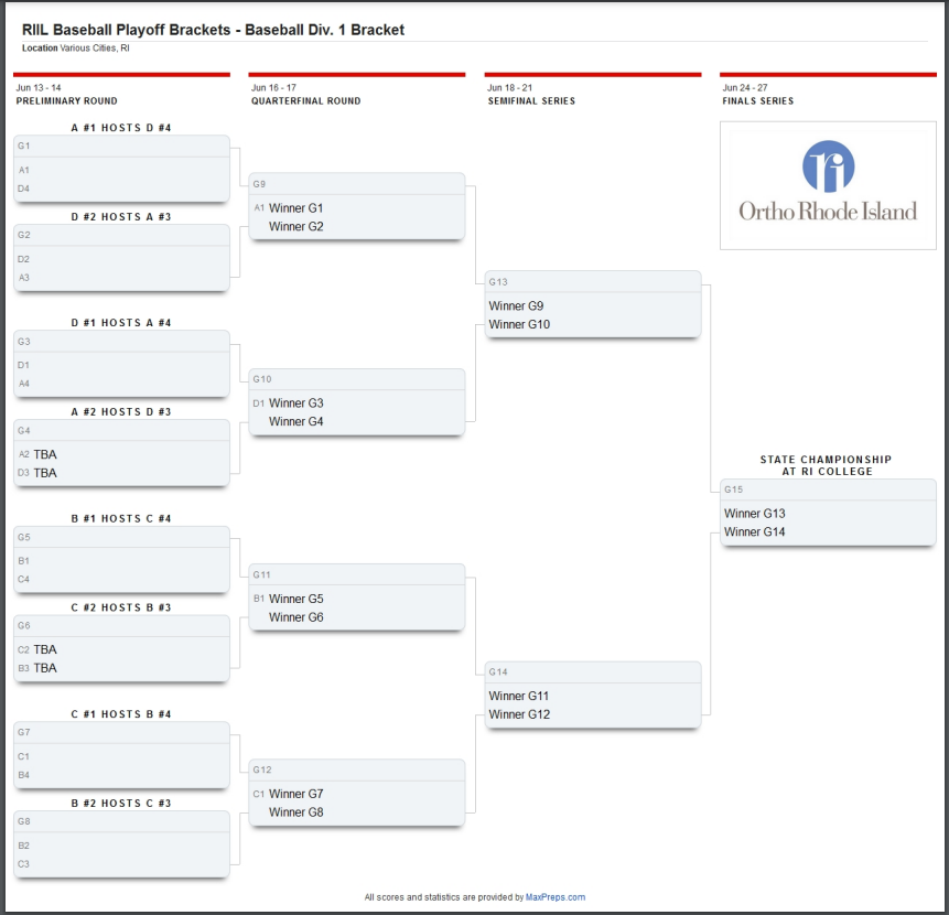 The Rhode Island High School Baseball Division 1 State Tournament will feature 16 teams. Based on the brackets on the tournament webpage, teams are ranked from 1 to 4 in each of their subdivisions (A, B, C, D) of Division 1. The #1 teams in each subdivision will play the #4 teams and the #2 teams will play the #3 teams. The brackets are set up for as a single elimination tournament for the opening rounds until the finals. In years passed, the finals has been a best of 3 series and I’m not sure if that will be the case again this season. The Division 1 State Tournament is set to begin opening round games on June 13th with the finals finishing up June 24 to June 27th. Here is a look at how the brackets shape up for Division 1, courtesy of the Rhode Island Interscholastic League’s webpage: