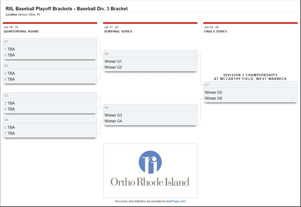 The Rhode Island High School Baseball Division 3 State Tournament will feature 8 teams. Based on the brackets on the tournament webpage, teams are ranked from 1 to 8 based on their regular season record. The #1 team plays #8, #2 plays #7, #3 plays #6, and #4 plays #5, again based on regular season record. The brackets are set up for as a single elimination tournament for the opening rounds until the finals. In years passed, the finals has been a best of 3 series and I’m not sure if that will be the case again this season. The Division 3 State Tournament is set to begin opening round games on June 14th with the finals finishing up June 24 to June 26th. Here is a look at how the brackets shape up for Division 3, courtesy of the Rhode Island Interscholastic League’s webpage: