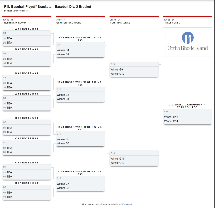 The Rhode Island High School Baseball Division 2 State Tournament will feature 16 teams. Based on the brackets on the tournament webpage, teams are ranked from 1 to 4 in each of their subdivisions (A, B, C, D) of Division 2. The #1 teams in each subdivision will play the #4 teams and the #2 teams will play the #3 teams. The brackets are set up for as a single elimination tournament for the opening rounds until the finals. In years passed, the finals has been a best of 3 series and I’m not sure if that will be the case again this season. The Division 2 State Tournament is set to begin opening round games on June 13th with the finals finishing up June 25 to June 27th. Like the Division 1 State Finals, the Division 2 State Finals will also be held at Rhode Island College’s Pontarelli Field. Here is a look at how the brackets shape up for Division 2, courtesy of the Rhode Island Interscholastic League’s webpage:
