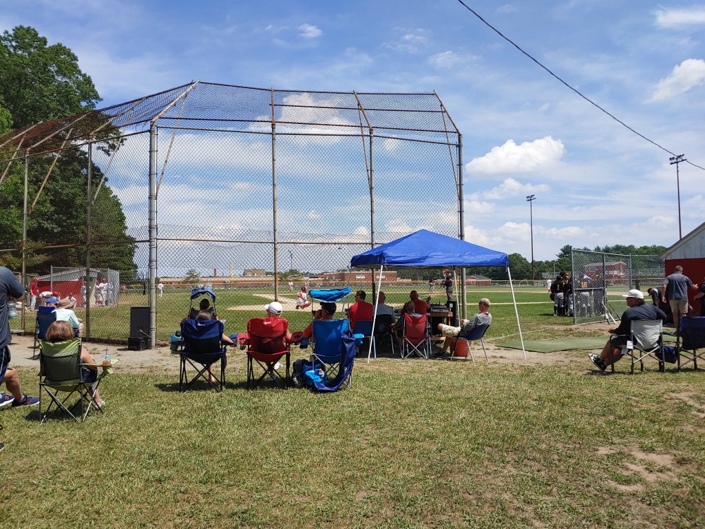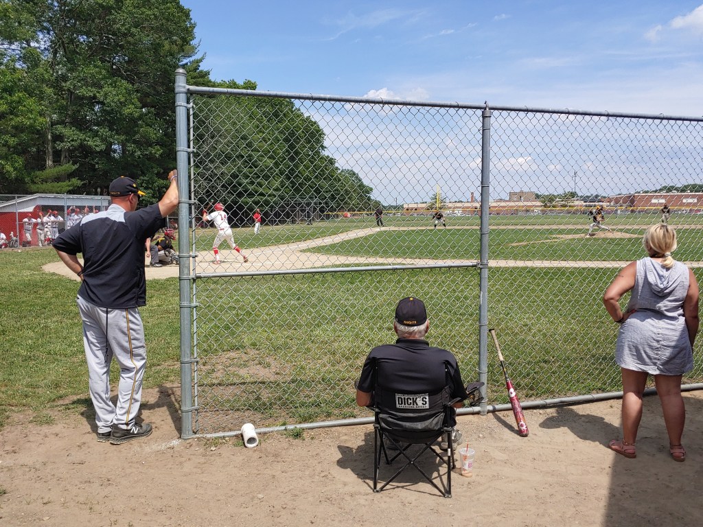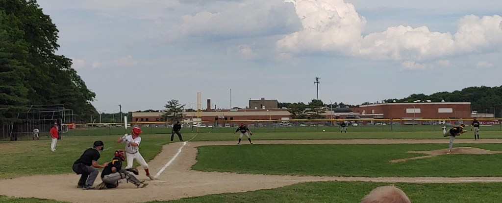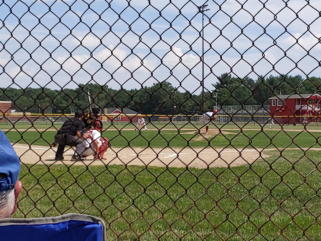 The weather conditions at game time were perfect for baseball. Blue skies, a few patchy clouds, breezy at times, clear and bright, and the temperature in the high 70s/low 80s. The field was in fantastic shape. The huge trees behind home plate and the third base side created a field perimeter from home plate all the way passed the left field foul pole. These trees, I would discover later, were also the perfect shade provider for a huge throng of fans who looked to escape the blaring sun. As I was walking up to the field, the game had started with Coventry Pitcher Jayden Voelker on the mound for Coventry.