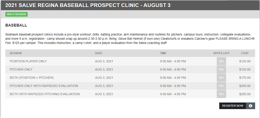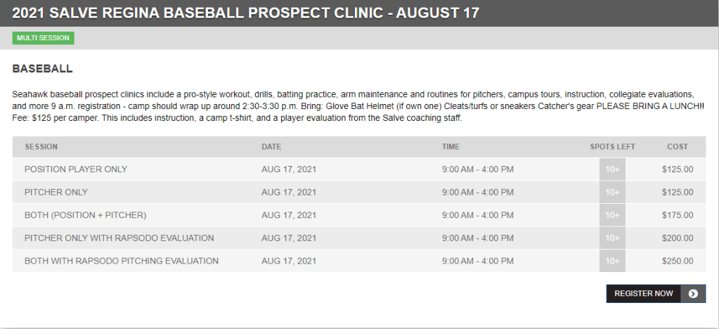 There is a Salve Regina Baseball Camp link that takes you to an information and registration page via their Twitter page. That link can also be found on the “Inside Athletics” section of http://www.salveathletics.com. Then, click the “Camps and Clinics” section to find the two baseball prospect clinic sessions. The two dates are August 3rd and August 17th. Here is a screen shot of the two camps and what you can expect: