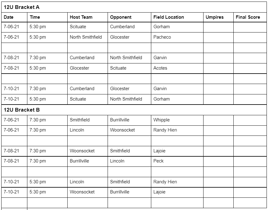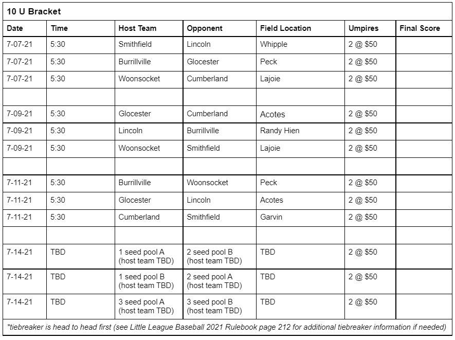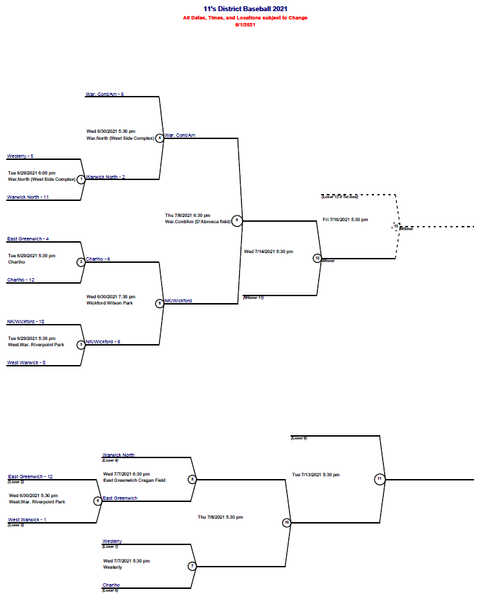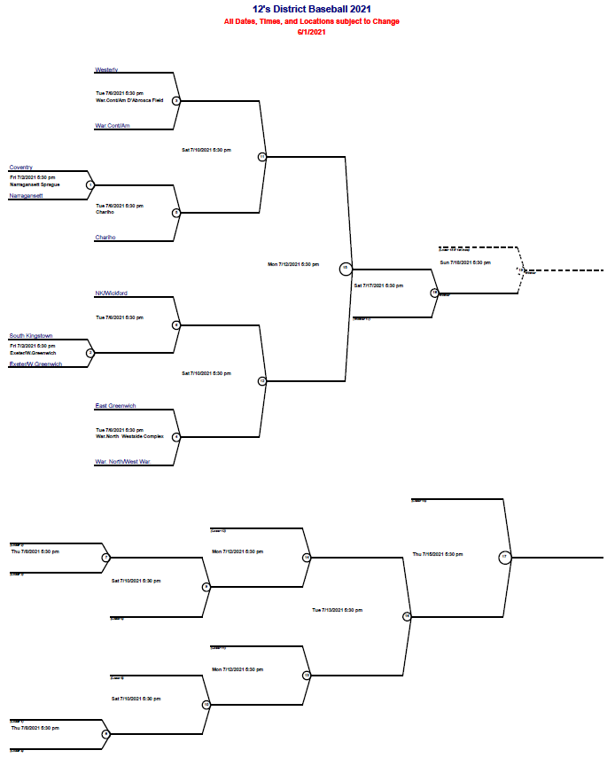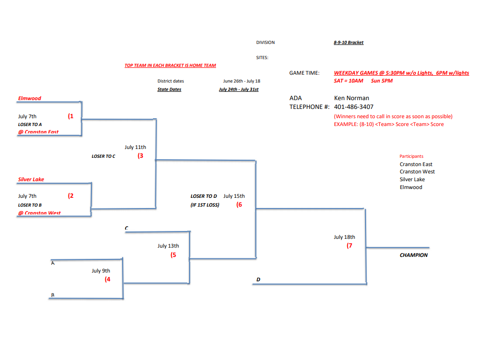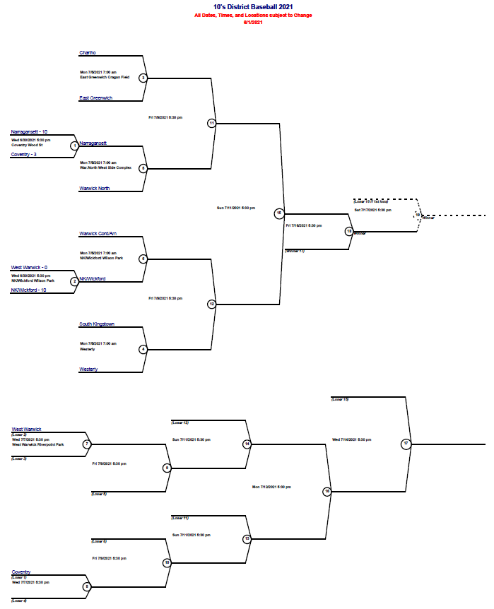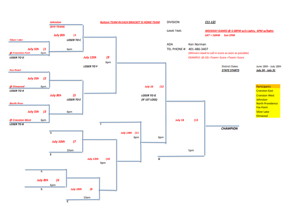 As the summer season begins, so do the Rhode Island Little League District All Star Tournaments. Throughout Rhode Island Little League fields starting in late June, players competing in 10U, 11U, 12U as well as Juniors and Seniors divisions will host home games and travel to face cross town rivals. The players are ready with new All Star hats and jerseys. The families are psyched for some big time drama and excitement. The concession stands are stocked with summer treats. The coaches have had their strategy sessions. It is now time to play ball and see who will move on to the Rhode Island State Little League tournaments this summer. Here are some of the brackets for District 1, 2, 3, and 4 of Rhode Island Little League: