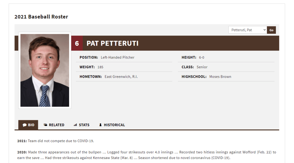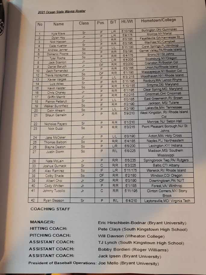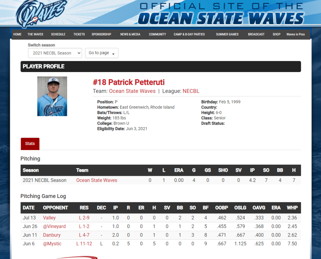 I stopped at Pat Petteruti for a second to read his stats – Senior, throws and bats left handed, from East Greenwich and Brown University. I remember reading in 2020 that Brown University baseball had started their season but (like every scholastic and collegiate sport) was cancelled due to Covid-19. I also remember reading that the entire 2021 Brown University baseball season was cancelled for similar reasons (Covid-19). I went back to the read up on other players from Rhode Island playing for the Waves. Baruch played at Boston College, Ramirez at URI, and Gamelin at RIC – all played significant roles on their college teams and all of these players played a decent amount of games. Maybe not as many as in 2019 or years passed, but Baruch, Ramirez, and Gamelin all played a lot of college baseball in 2021. Not the case for Petteruti and I was curious as to how he handled this very unique situation – mentally and physically. Pat and I recently connected via email and here is an excerpt from our conversation.