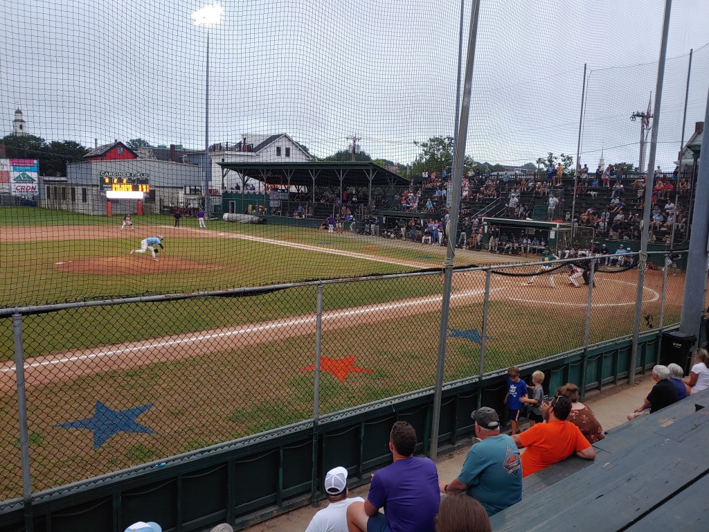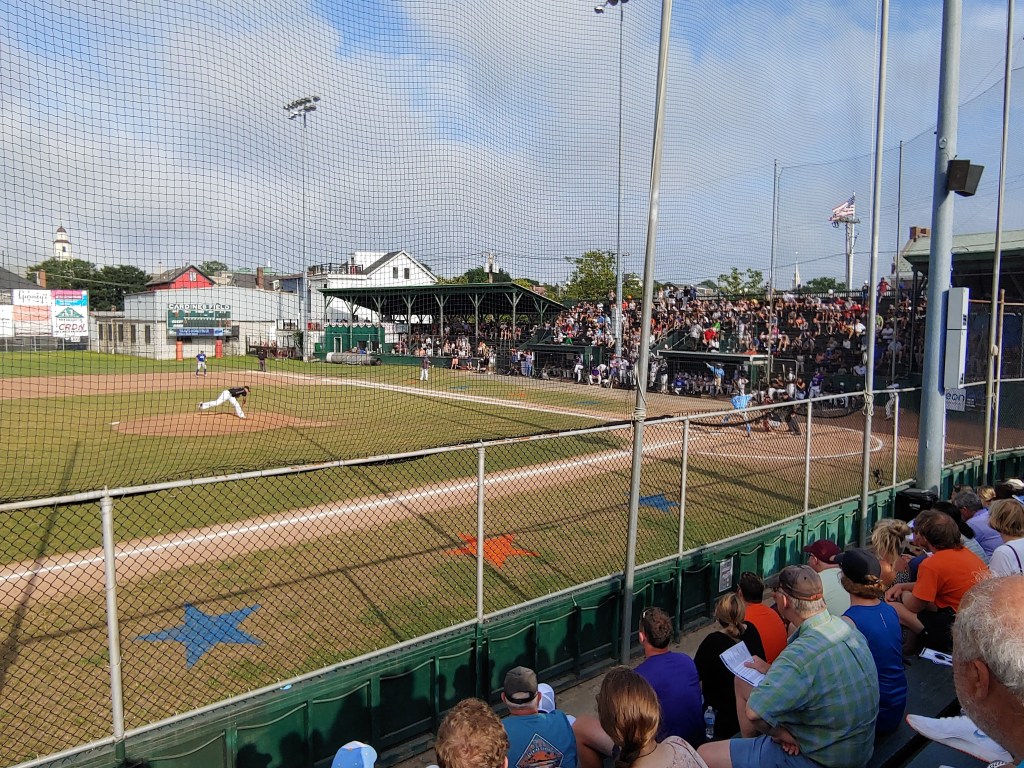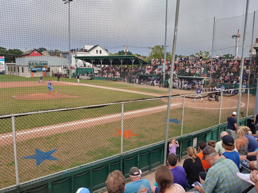 First pitch was right at 5:07pm and the 2021 NECBL All Star Game was officially underway. Just after first pitch, I spun around to check out the crowd and wow, fans started filling just about every available seat. The section behind home plate was chained off for the professional scouts and media covering the game. The Gull’s legendary PA Announcer Don O’Hanley was back behind the microphone and up to his usual sarcastic self. O’Hanley is such a treat to listen to and I love his sense of humor and comedic timing. Corny at times, yes, but so original and so awesome that he was a part of the All Star game experience for me.