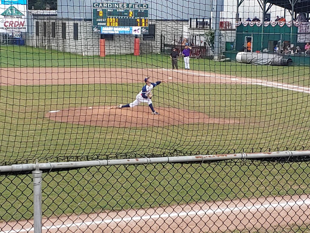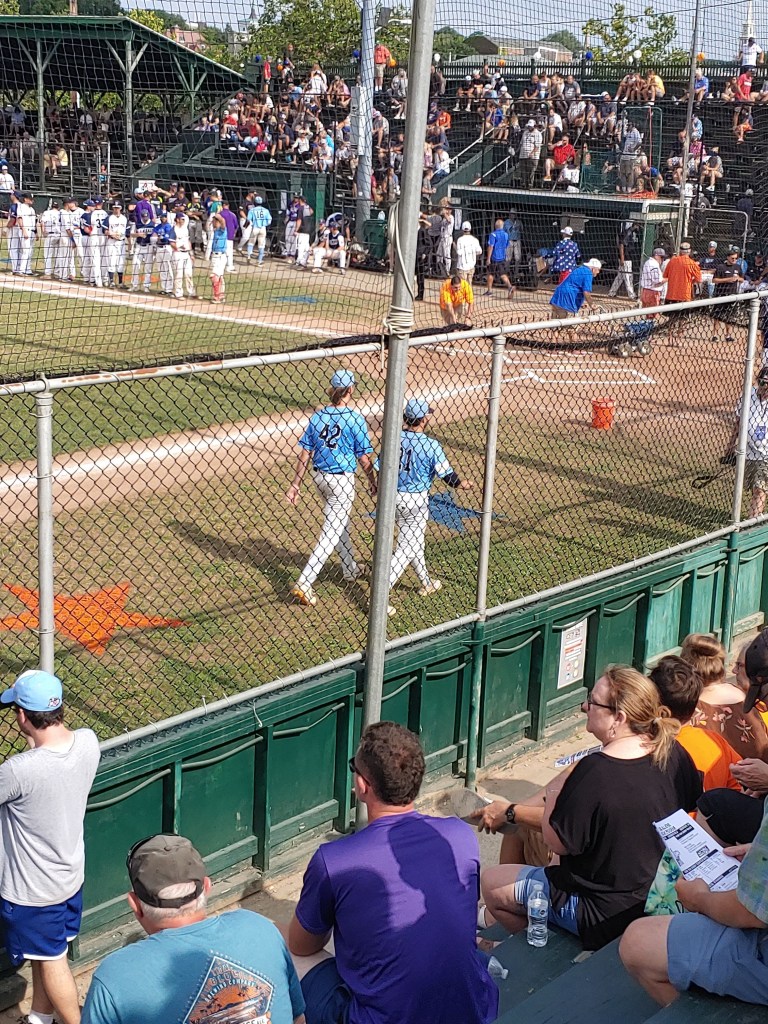 Just after 4:30, Newport Gulls President Chuck Paiva took the microphone and escorted a number of people out to the pitcher’s mound area for some opening remarks. He welcomed everyone to the 2021 NECBL All Star Game, recognized board members of the NECBL, as well as Gulls Board of Director members, and longtime Medical Staff member Norm Provost got to throw out the first pitch. The color guard was presented, walked slowly in from the first base line out to center field, and all the players and fans were asked to remove their caps and stand for the singing of the national anthem. After the anthem was sung, players and fans remained silent as the color guard marched slowly back to the first base line. It was so silent in the stands at Cardines during this march that I could hear the metal clips holding the netting clinging against the metal pole in front of me. Truly, a sight to see and a silence to behold.
