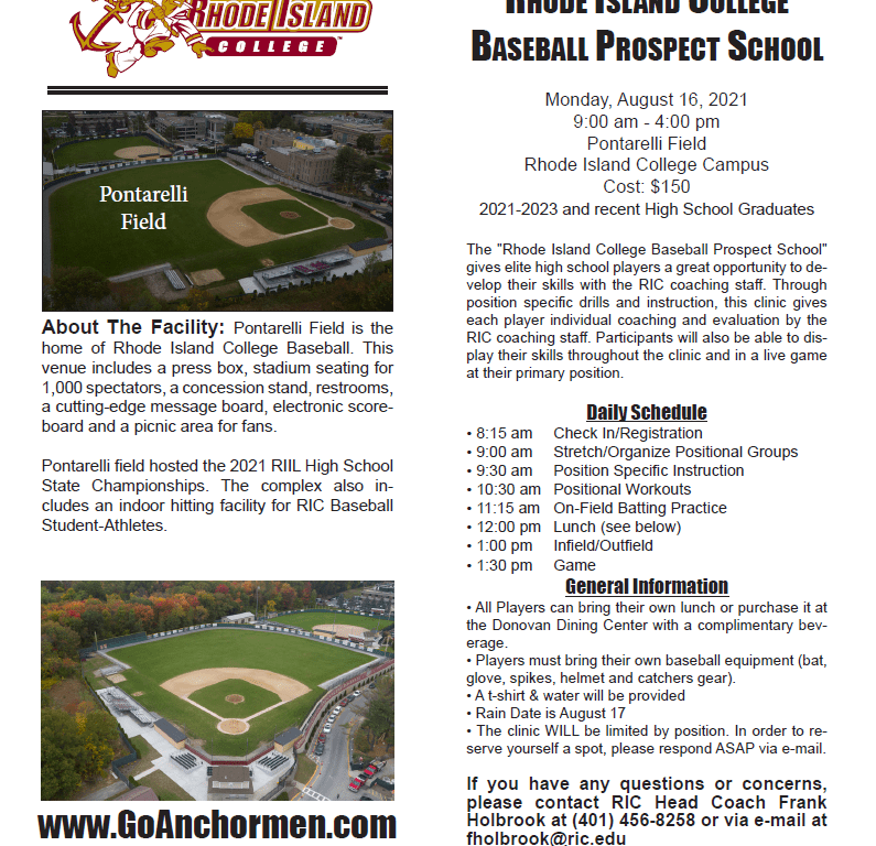 I received a notification this week on Twitter via Coach Frank Holbrook of Rhode Island College about an upcoming event in August. Rhode Island College will host the 2021 Summer Prospect School on Monday August 16th. This prospect school will take place on the campus of Rhode Island College and will be coordinated by Coach Holbrook and his RIC Baseball staff. The one day event will feature coaching, evaluation and instruction for high school players from Class 2021-2023. Positional workouts, assessments and drills will be followed by a live game to end the event’s schedule of activities. I have attached the registration flyer for the 2021 Rhode Island College Prospect School below.