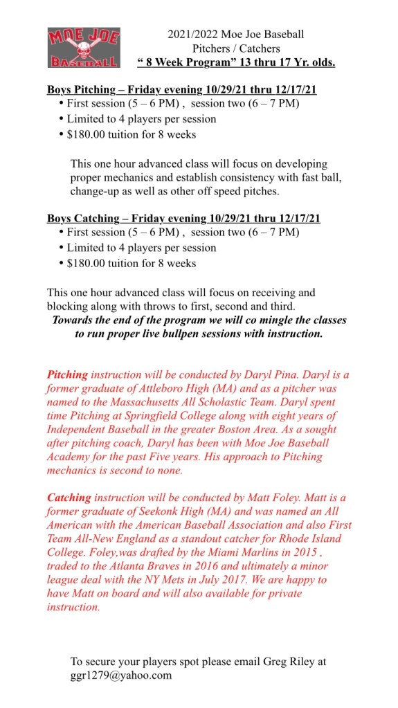 To recap, Pitchers and Catchers 8 week program running from October 29th through December 17th. Pitchers will work with Daryl Pina, who is a Springfield College alum and has been with Moe Joe for 5 years running. Catchers will work with Matt Foley, a Rhode Island College alum who spent a few seasons in professional baseball with the Marlins, Braves, and Mets. Contact information for this Moe Joe Baseball program is Greg Riley and his email is ggr1279@yahoo.com.