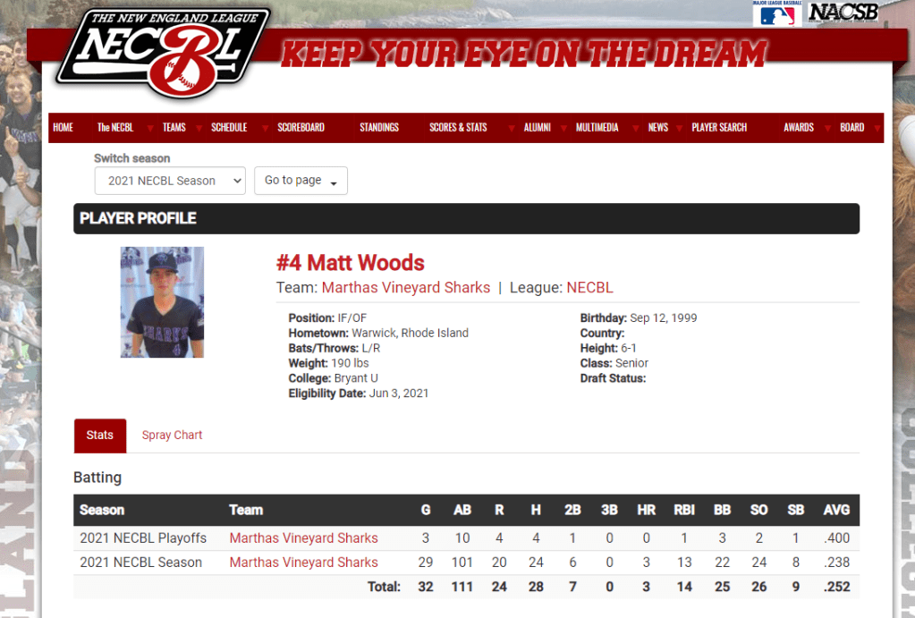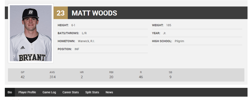 Every Spring for the past several years, I await the rosters to be announced for local collegiate summer baseball leagues. In particular, the New England Collegiate Baseball League who features two teams (The Newport Gulls, Ocean State Waves) that play their home games within 15 miles of my home, making it very convenient to attend games. The purpose – I scan the rosters for Rhode Island born players and put a check mark next to the games when these RI players will be playing for or against the Waves or the Gulls. One player I had check marked this summer was Warwick native, Pilgrim High School 3 sport star and current Bryant University Bulldog Matt Woods, who played for the Martha’s Vineyard Sharks.