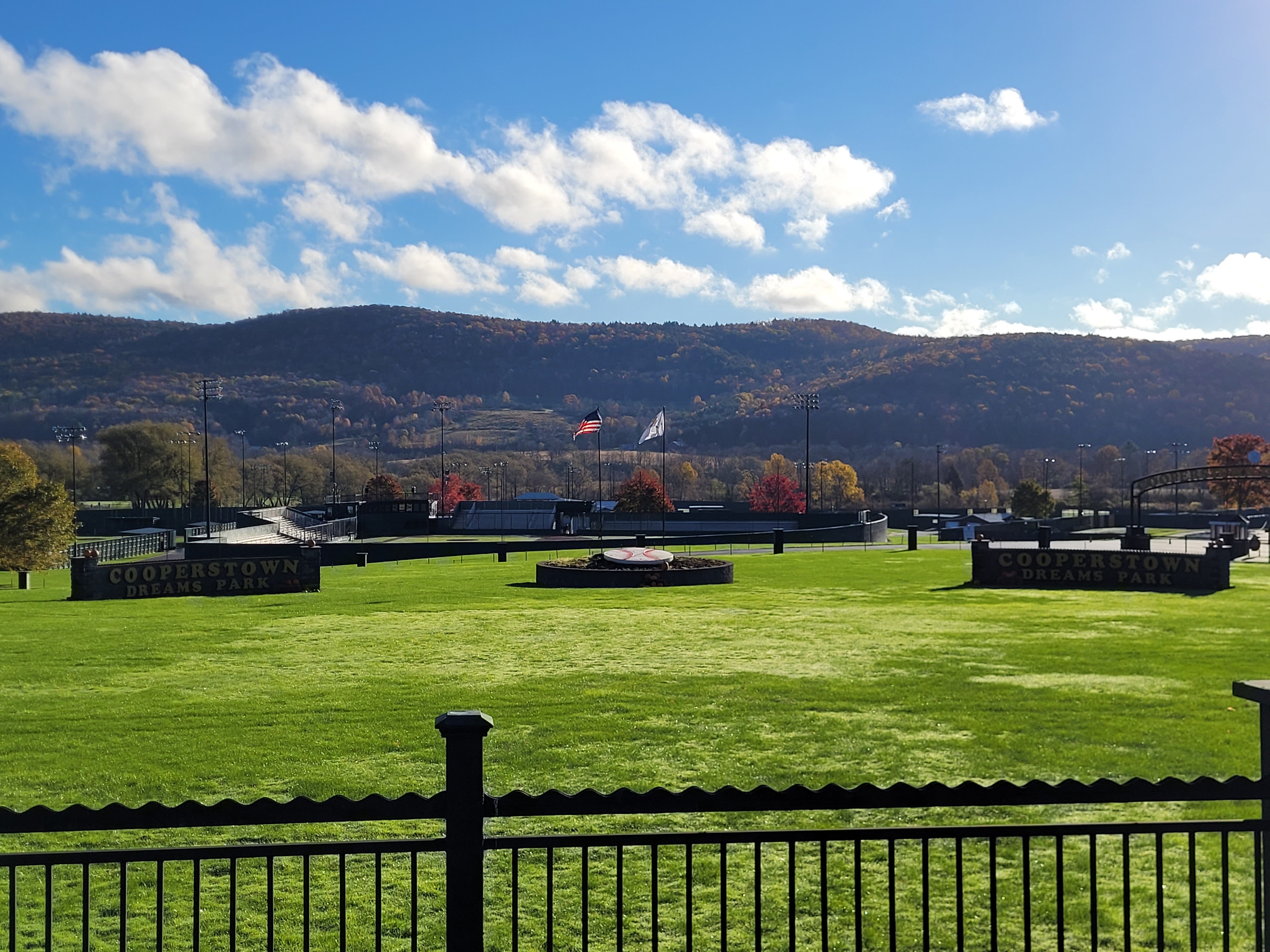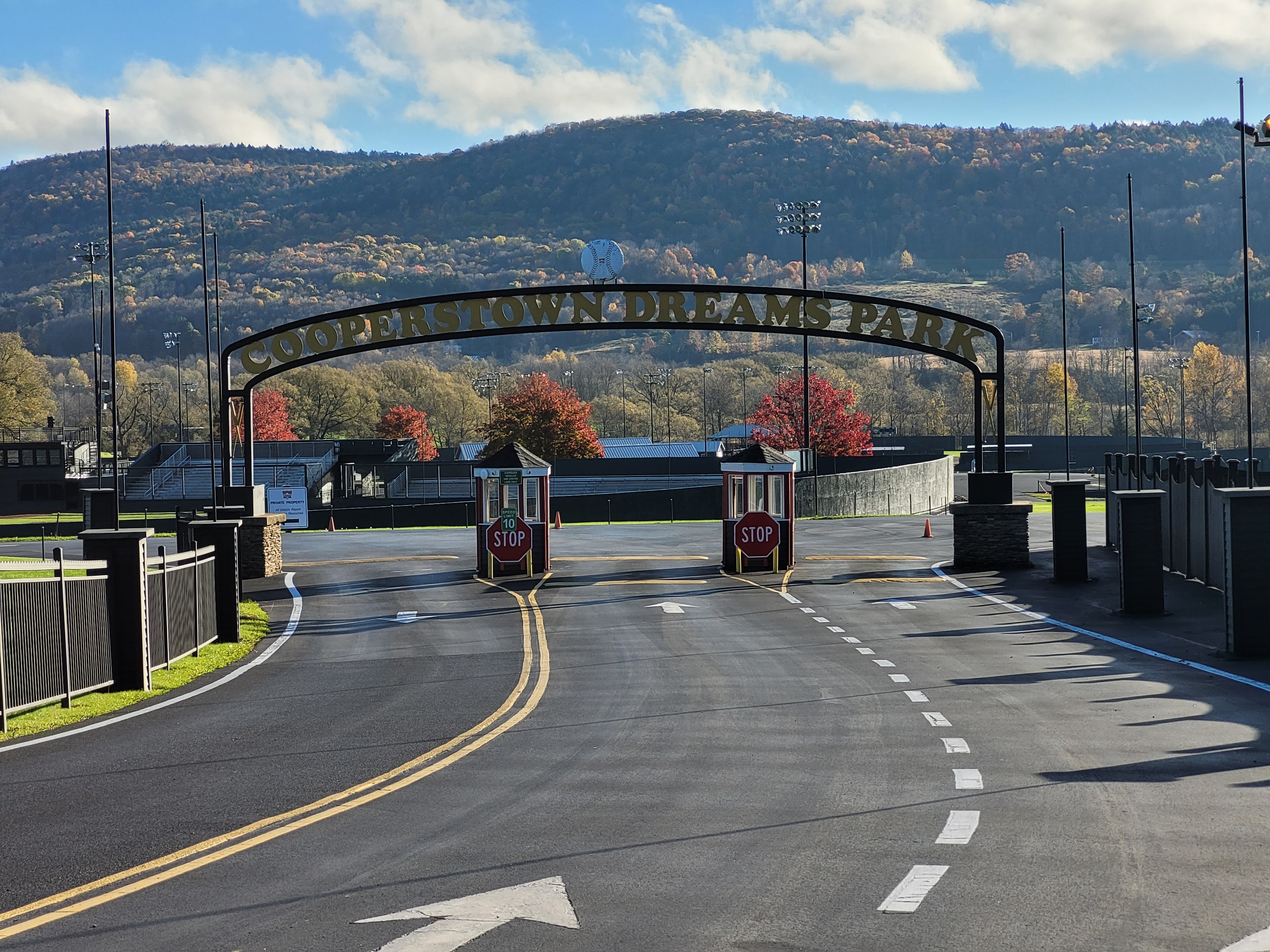 After resting a bit and grabbing a bite to eat, Rachel and I decided to venture into the Village of Cooperstown before it got dark to preview our Friday adventures. Leaving the hotel with no clue which way I was going, I decided to take a left out of the parking lot. And out of the corner of my eye, like a pitcher spotting a baserunner at first taking a wicked big lead, I spotted the Cooperstown Dreams Park entrance. I was so stunned, I drove right past the entrance and had to pull a U-turn down the street at a farm. Here is what I saw out of the corner of my eye: