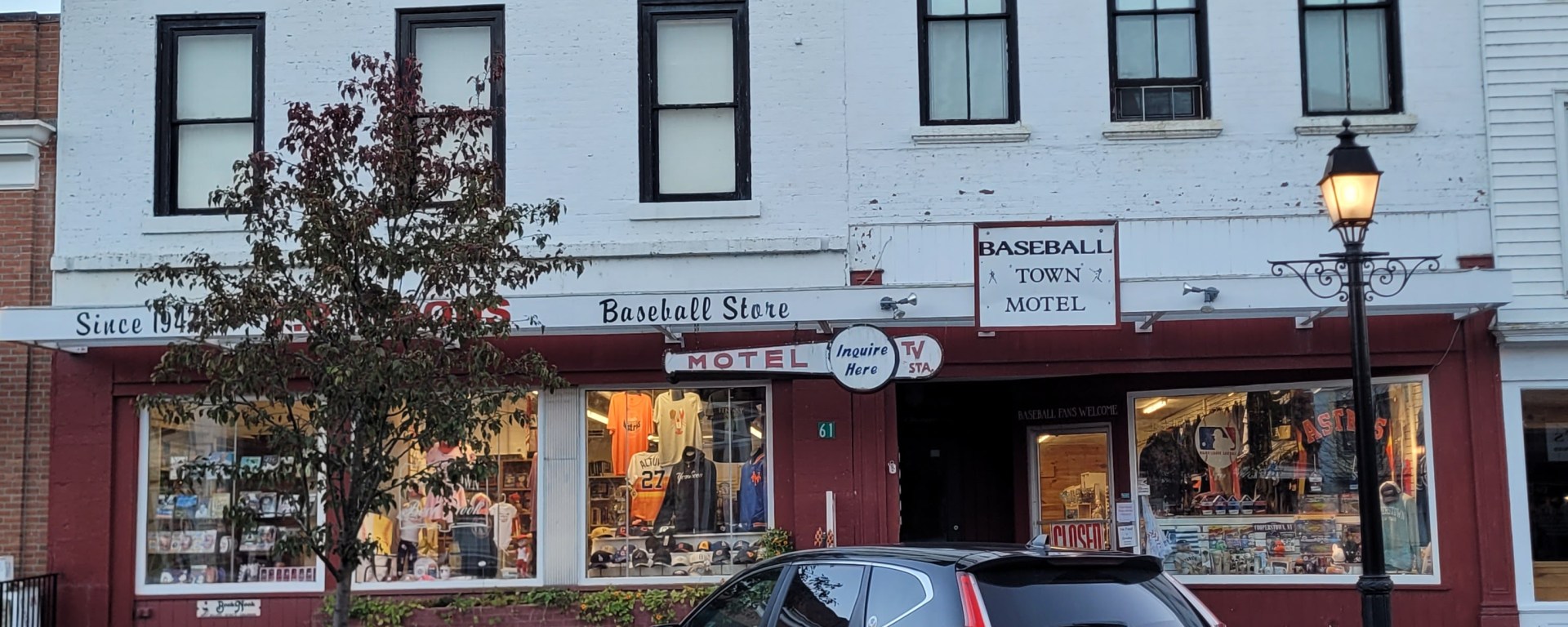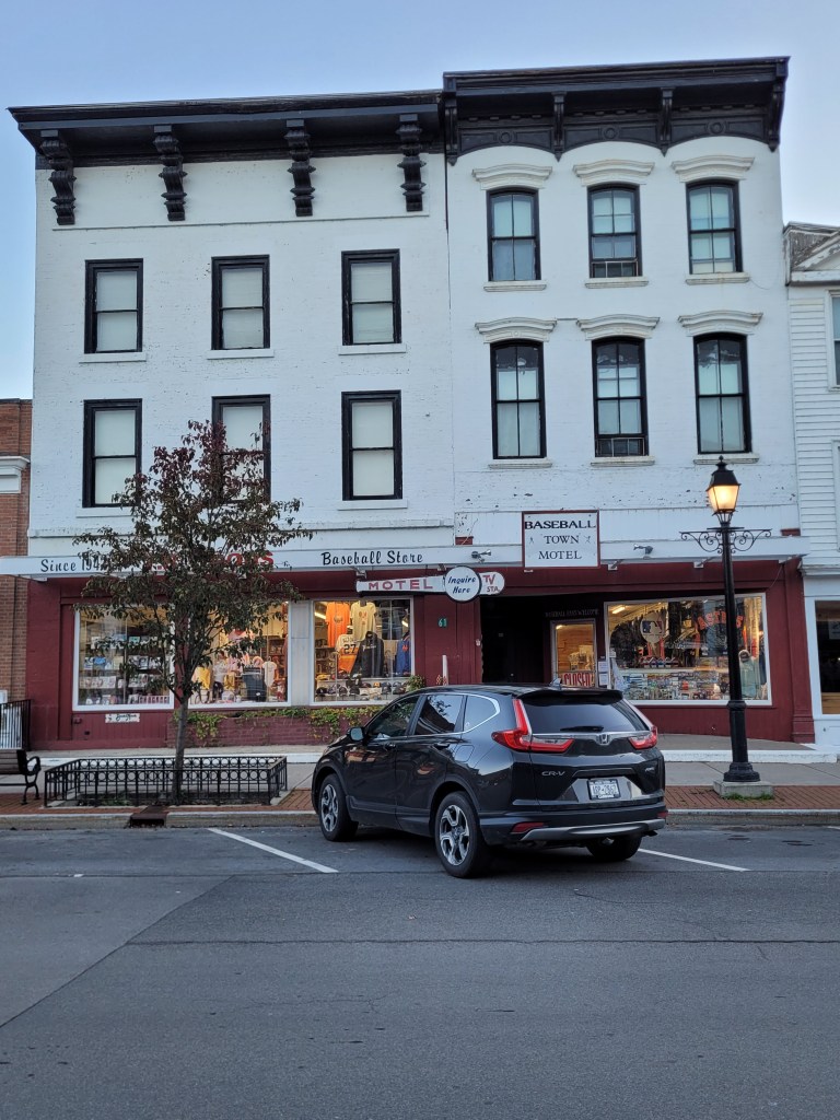 As the sun was setting, we walked the brick walkway out of the Doubleday Field parking lot and onto Main St. Clean does not begin to describe how clean the Village of Cooperstown is/was. No coffee cups, no cigarette butts, no paper, no discarded face masks, no sign of trash anywhere except in the designated receptacles on the sidewalk. The town, the businesses, the mindset – a clean town is inviting and welcoming. There were street signs marking historical landmarks. The businesses had menus in their windows and clean glass so you could peer into them and fall decorations galore. Sure, the majority of businesses that were open were food and drink places. As with the businesses around Doubleday Field, Rachel and I took a long walk up and down Main St to get a sense of the businesses in town we hoped would be open on Friday.