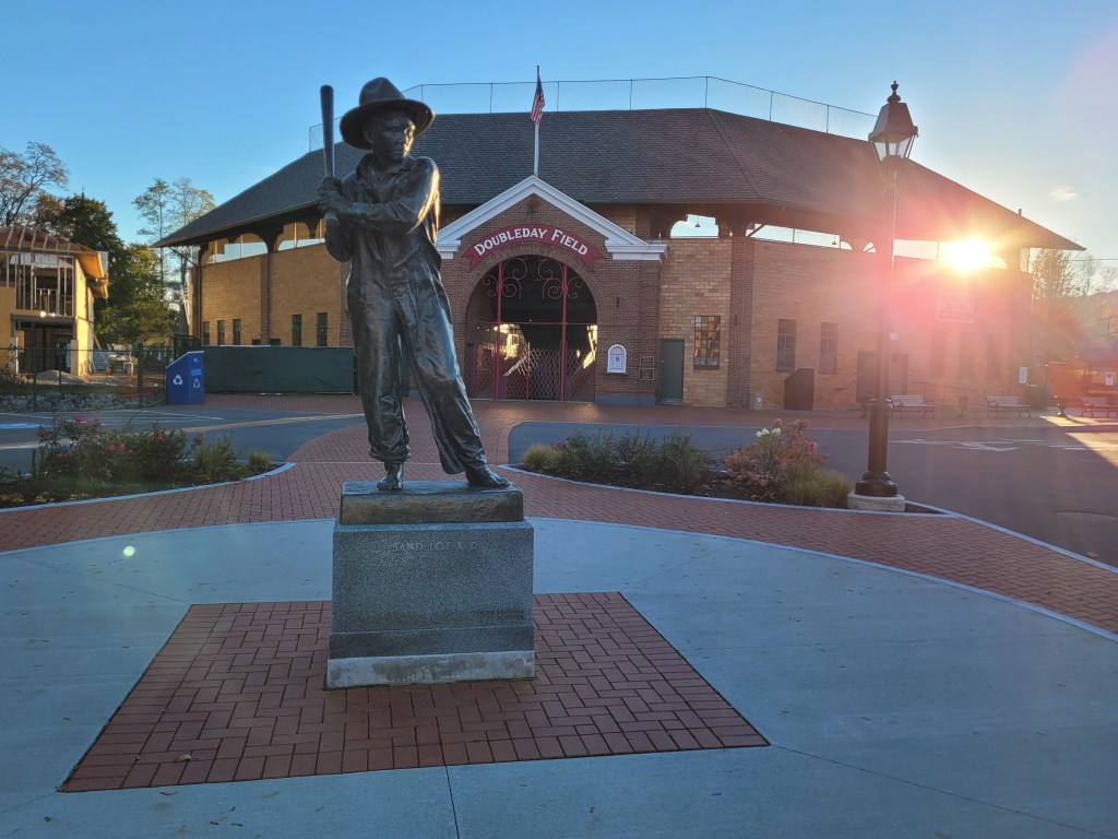 According to an online blog by the Syracuse University Press, “The Sandlot Kid” was placed in front of Doubleday Field (dubbed “The Birthplace of Baseball) in 1940. It is a tall pedastled statue of a young lad preparing to hit a baseball in the 1800s.“