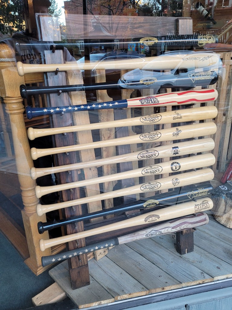 Business owners had tons of great window displays that really caught my eye, like this one with the bat rack. I happen to own a Louisville Slugger wooden bat! And I recognize a bat from “The Natural” on this rack as well.