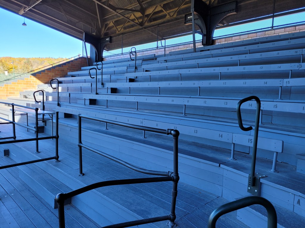 I walked up the ramp and into the bleachers behind home plate and took a wide expansive view of Doubleday Field. Bleacher seats, much like at historic Cardines Field in Newport, surrounded the park. In the first base area, out in the outfield stands that formed the perimeter of the outfield to about the center field area, all numbered and lettered for row and seat assignments. Fall foliage and blue skies help paint the background of this incredible baseball field. There was a camera well with a small cutout in the mesh of the backstop fencing and I snapped a photo of the field.