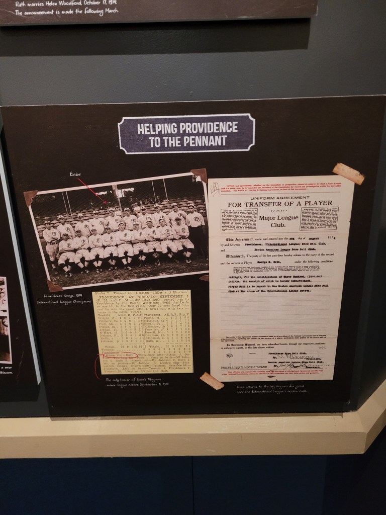 The Providence Greys have tons of references in the Hall, including this one in the Babe Ruth section. Here is Babe pictured with his Greys teammates after a winning pennant run in 1914. In the box score, it shows Babe Ruth recording a home run.