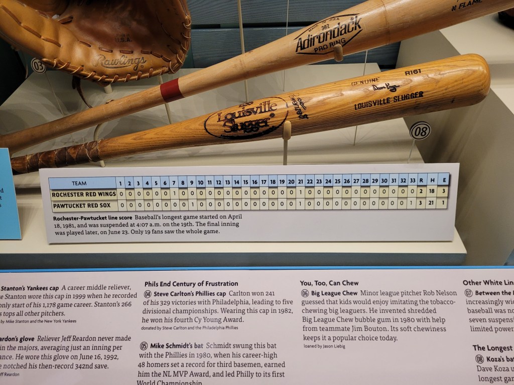 At the old McCoy Stadium, in the vendor sections, you could see tons of references to the Longest professional baseball game ever played between the Pawtucket Red Sox and the Rochester Redwings. 33 innings, over 2 days and several months with a final score of 3-2, PawSox! Here is the bat used by Dave Koza that produced the winning run batted in.