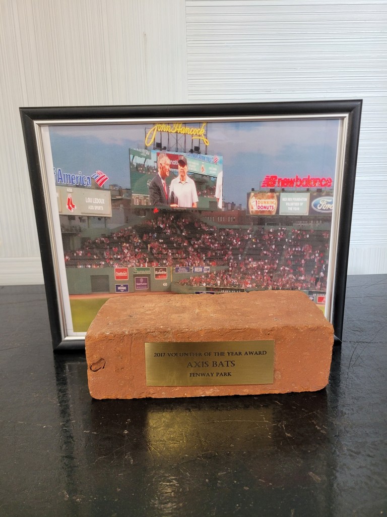 After my tour of how a bat was made and some of the manufacturing steps in the bat making process, I sat down with Lou to ask him some questions about Axis Bats and the bat business. However, we shifted briefly towards his passion for community service, volunteering, and family. We exchanged stories about family (we have a common bond with family members who are on the Autism Spectrum), the Ledoux League in Fall River which his father orchestrated, and the important charity work Lou himself has been involved in the city of Fall River. Starting with the amazing concept of the Ledoux League to his work with the Red Sox Foundation to the “Batting for Average” program with the Fall River Police Department, the Ledoux family has an unbelievable history of community service in the Fall River area and honestly it stretches far beyond. He got up from his desk to show me a framed photo of him at Fenway Park accepting the 2017 Volunteer of the Year award.