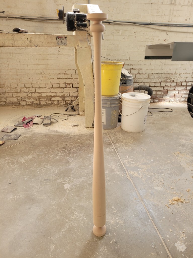 Lou was in charge. “Hey you want to see how the bats are made?” Again, I thought to myself, ‘this is going to be fun.’ I said yes and we walked through his office area into the baseball bat factory where hundreds of bats were in lined up in bins. Lou pointed to the corner of his factory, “come on, I’ll make you a bat” and walked me over to the rack of (wood) billets next to this huge wood cutting machine (lathe) attached to a computer. “Stand over there, you can get a good shot of how it gets run through the machine and becomes a bat!” After making tens of thousands of wooden bats for professional athletes, collegiate players, summer leagues, AAU kids, Lou Ledoux appeared visibly giddy about making a wooden bat for someone. He went over to the machine, turned it on, went to his computer, opened up the software/bat making program, hit start, and stood with me as a wooden bat was made in the machine. Keeping his teacher’s hat on, Lou explained the precision cutting, how the shape of the knob is determined, why the bat is cut a certain way, the fact that he can customize a bat for someone by reshaping it in the computer prior to starting the machine, and even what Axis Bats does with the sawdust and excess material cut off the bat. And here is the bat just out of the giant machine: