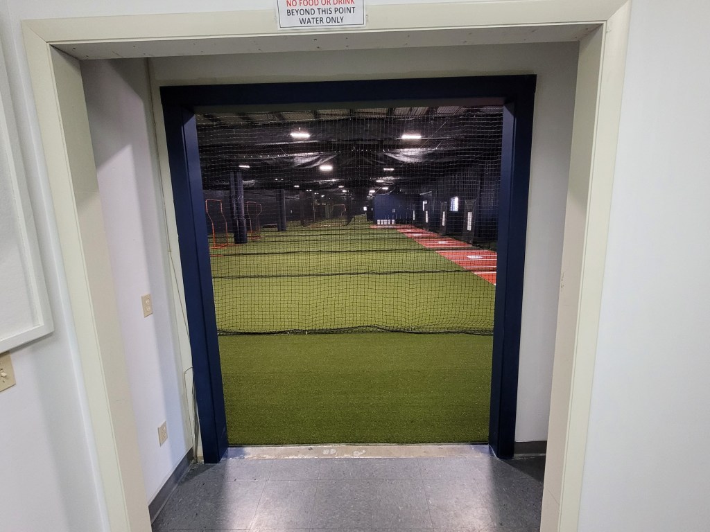 Good size parking lot and just a few steps up to the front door of “Facility of Dreams.” The front door has hours of operations listed as well as the mask policy of the facility. As it was barely 20 degrees outside, I hustled into the facility and was warmly greeted by Ocean State Outlaws Coaches and Facility of Dreams owners Phil Dupras and Brendan Monahan. In the space where I met the two coaches, I could see a large waiting room area with tables and chairs set up. A flat screen TV was mounted to the wall with ESPN playing highlights of last nights sport’s action. To the right, there was a large conference room with table and chairs set up for meetings and round table (well the table was more oval than round) team meeting and discussions. First impression – great layout and use of space, clean, and very welcoming. Phil, Brendan, and I chatted about baseball and sports and their facility’s Covid-19 protocols (proper signage, hand sanitizing stations) for a bit, then started with the tour. Great guys, very friendly and personable. “Welcome to our facility,” motioned Phil with his right arm and we walked towards an open area to peer out into the “Facility of Dreams.”